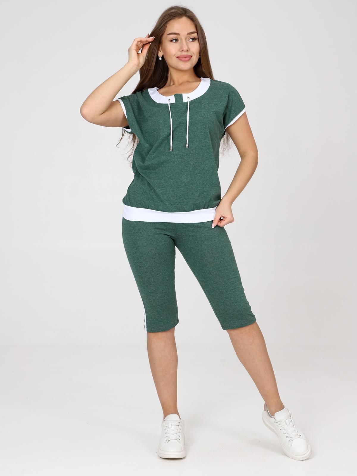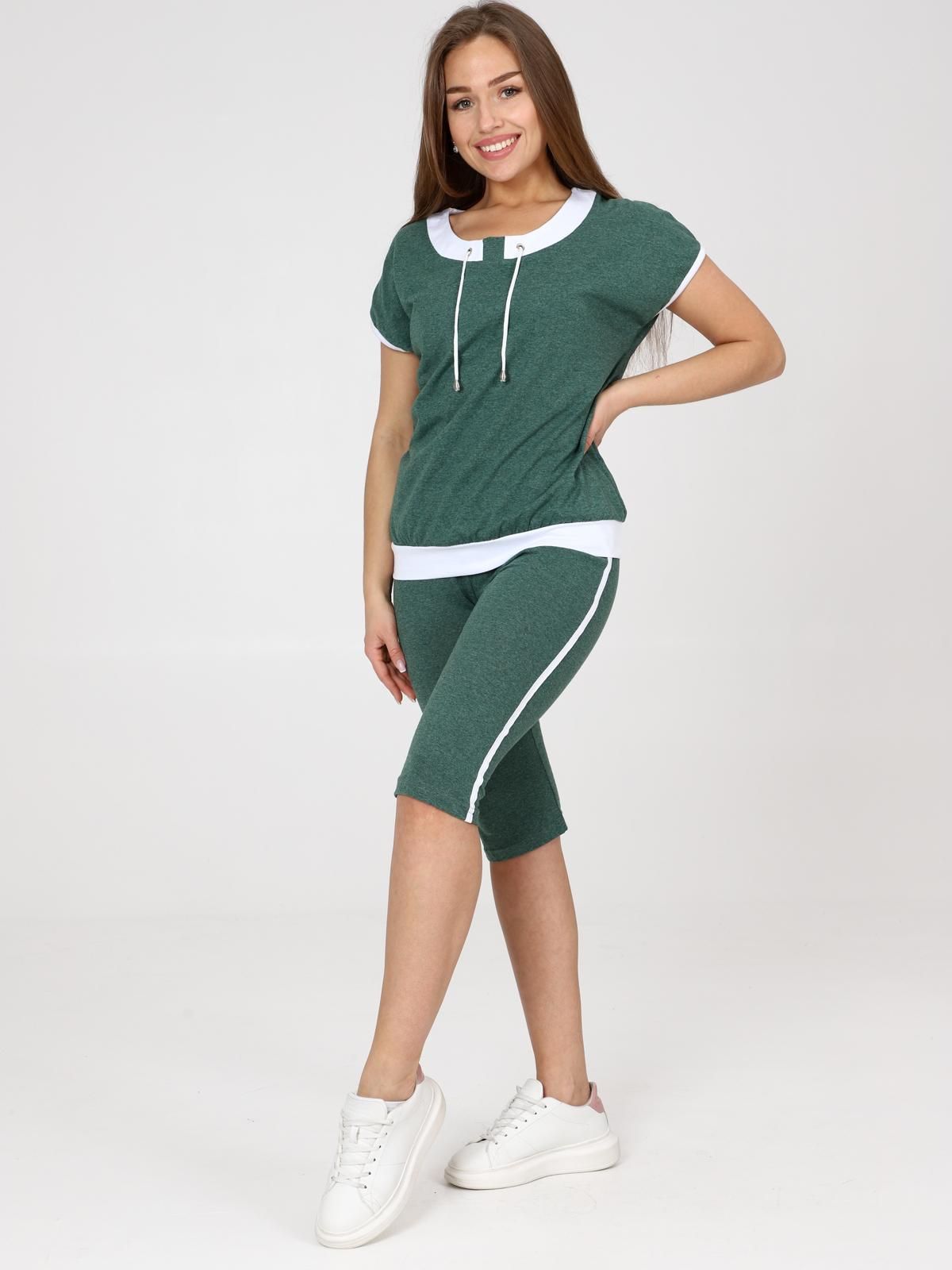 Костюм изготовлен из трикотажного хлопкового полотна "кулирка". Футболка свободного силуэта со спущенным плечом, обтачка горловины и пояс футболки из кулирки контрастного белого цвета, так же контрастной бейкой окантованы рукава футболки, горловина декорирована шнурком. Облегающие бриджи с лампасом белого цвета, карманами в боковых швах и поясом на эластичной тесьме.