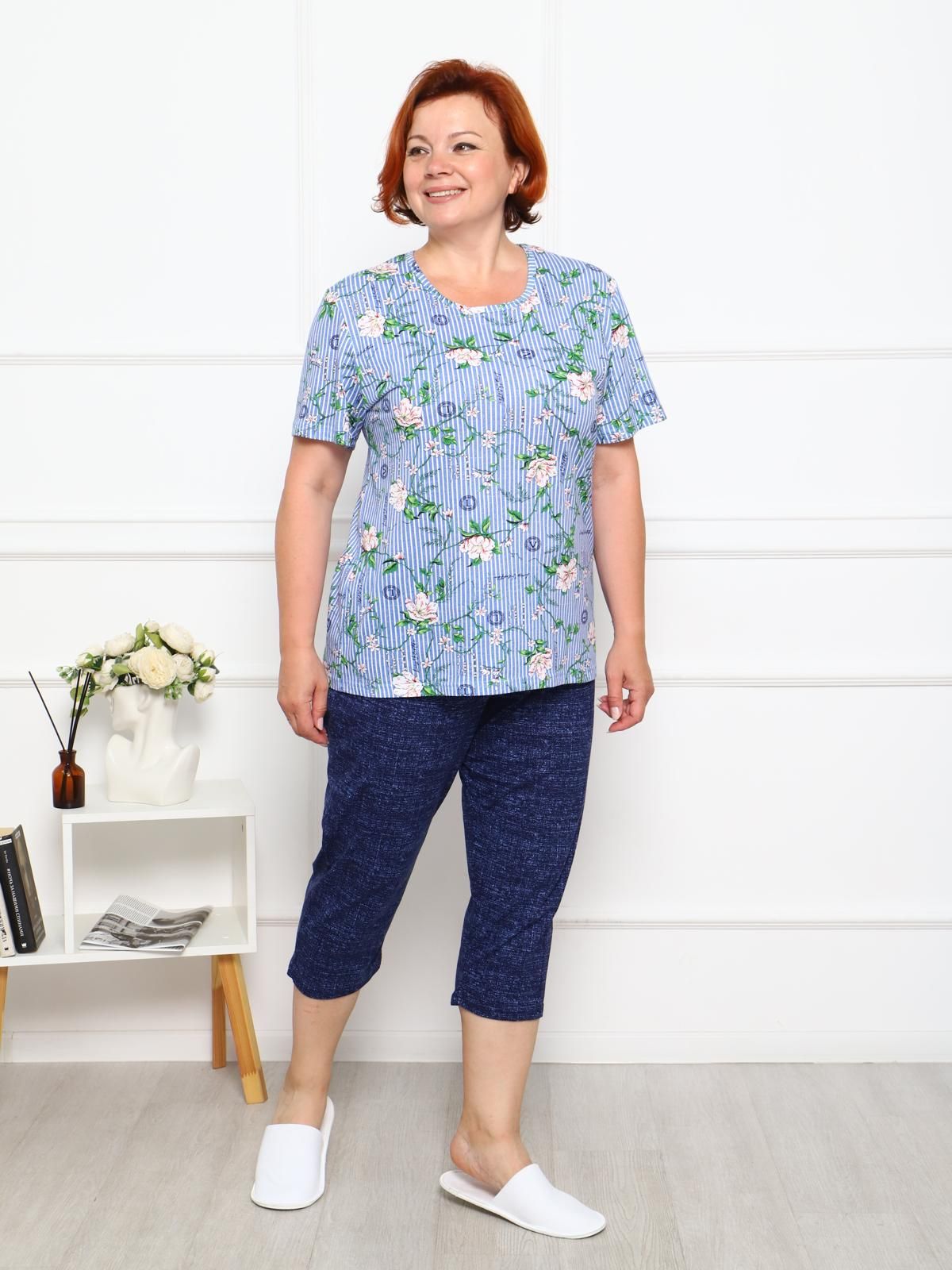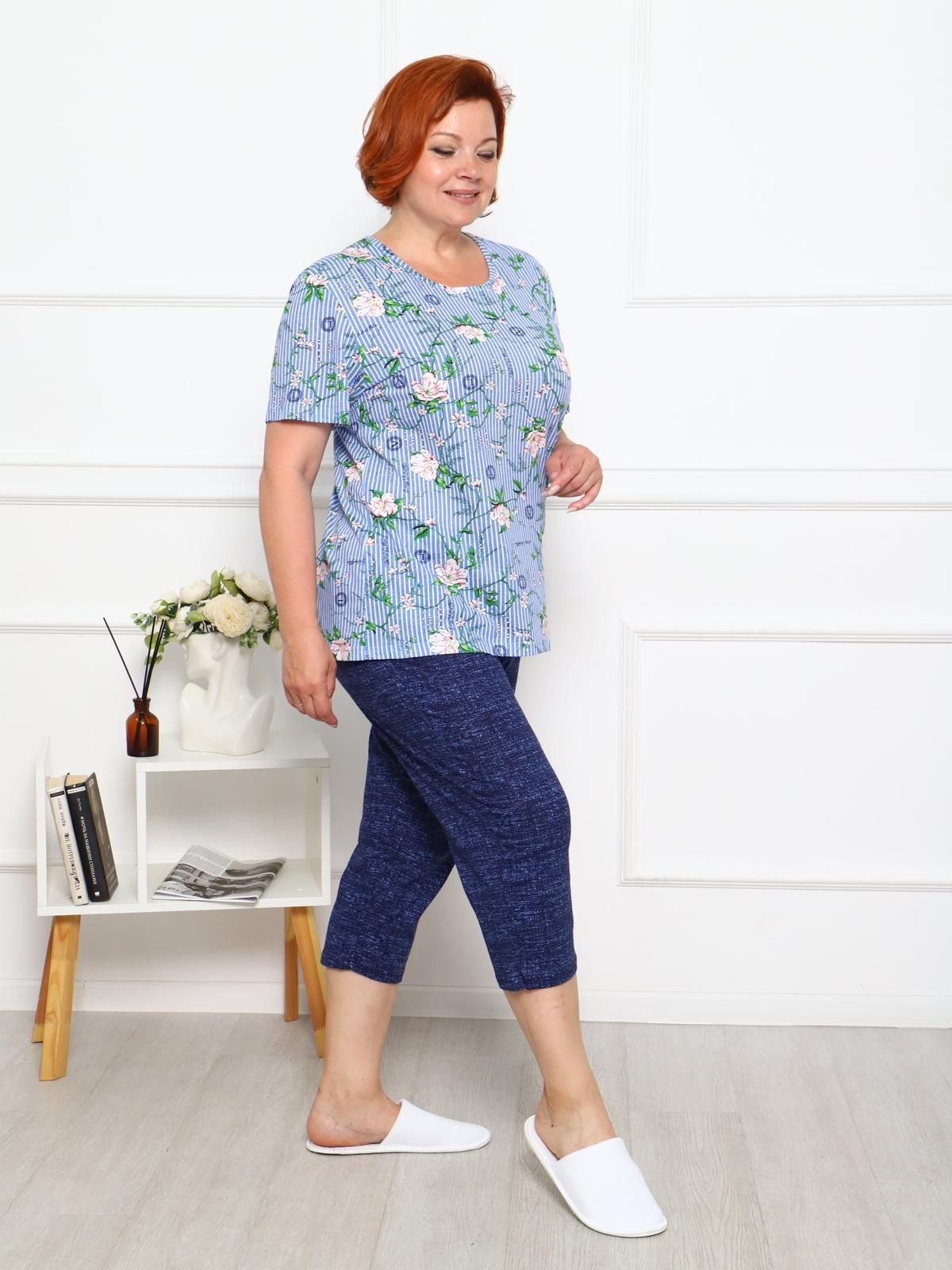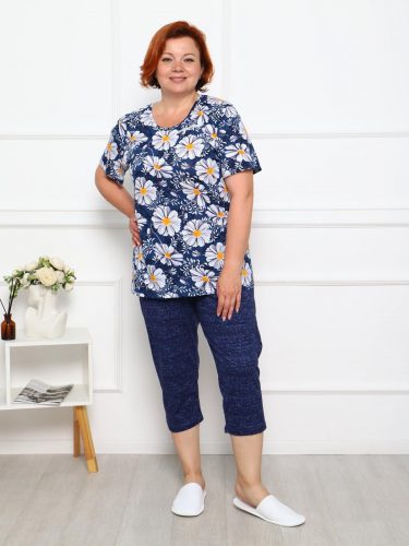 Костюм «Рандеву» для повседневной носки. Выполнен из легкой трикотажной ткани. Является оптимальным выбором для дома и отдыха. Футболка с оригинальным модным принтом, свободного силуэта, длиной чуть ниже бедер. Бриджи полуприлегающего силуэта.