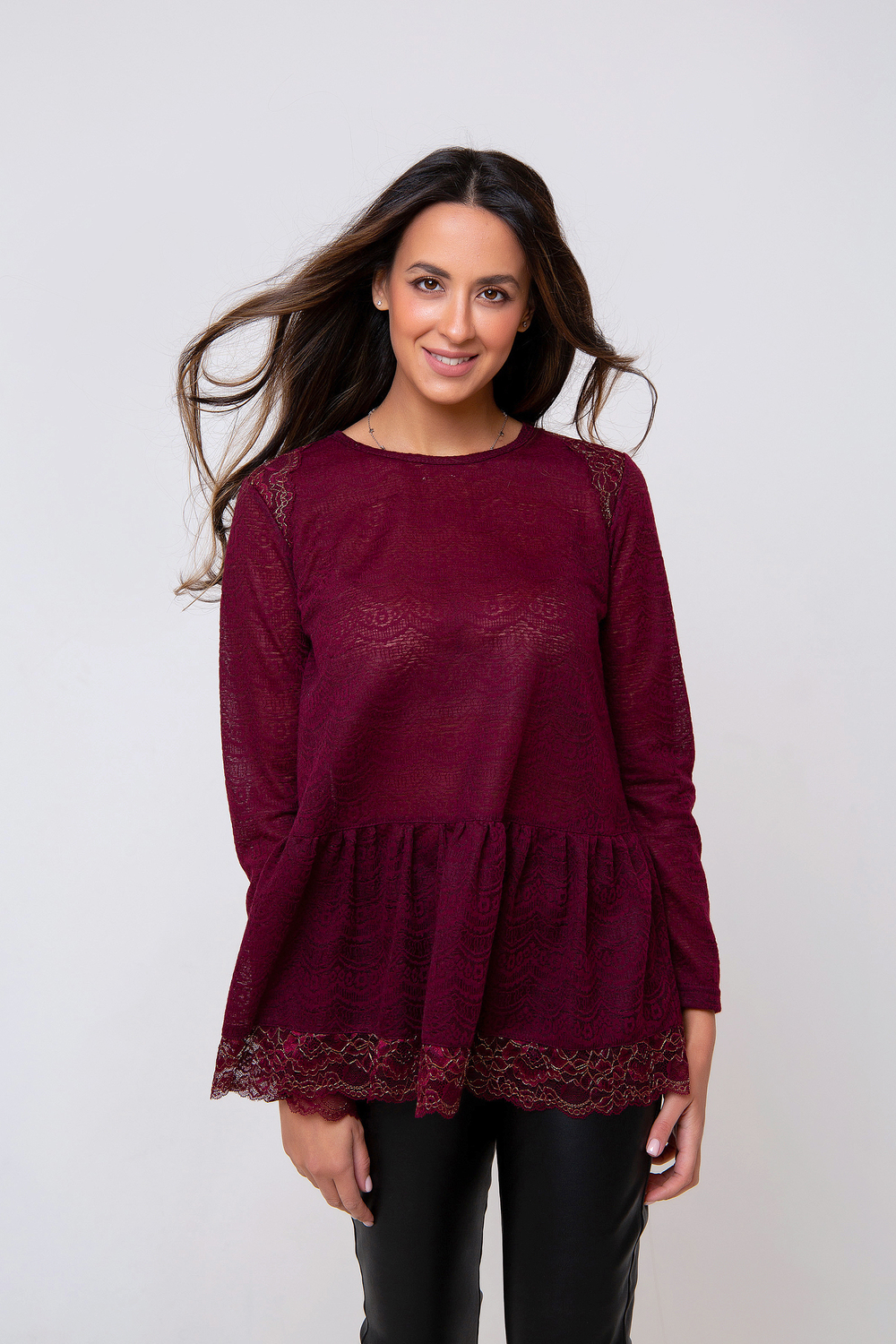 Трикотажная туника-блуза глубокого оттенка, выполнена из полупрозрачного материала. Модель однотонная, оформлена резинкой на талии, а также вставкой из гипюра по краю изделия. Рукав длинный. Горловина округлая. Состав: 75% полиэстер, 20% вискоза 5% эластан. Длина изделия 65 см. Рост модели на фото 173 см (+ каблук).