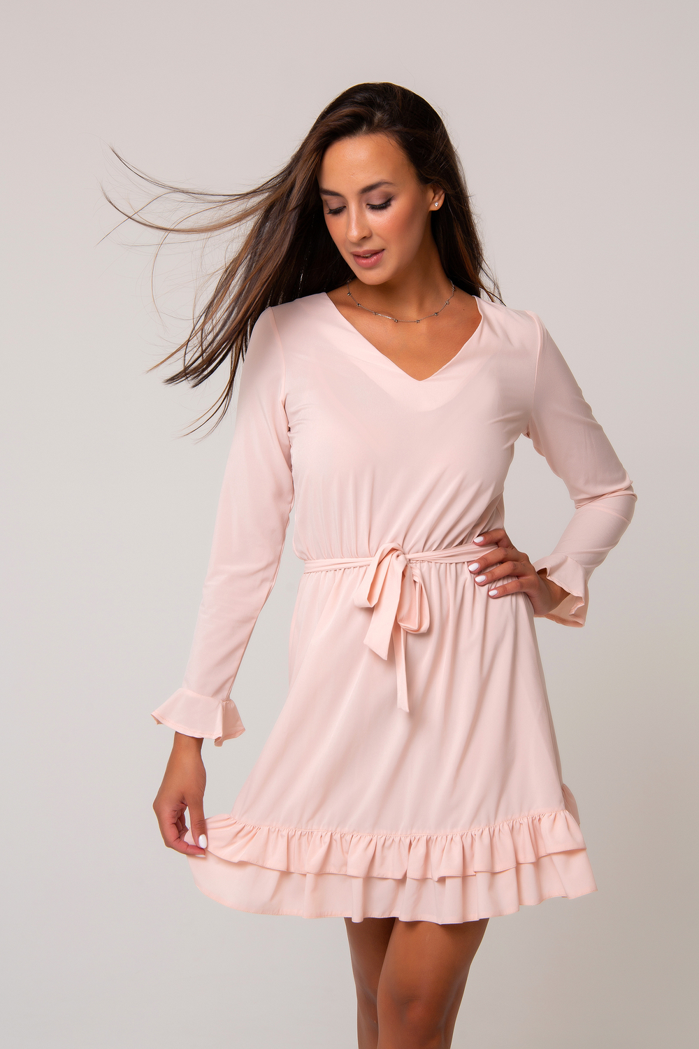 Платье А-силуэта, выполненное в нежном приятном оттенке. Рукав длинный, декорирован воланом, что придает платью женственности и романтичности. Край подола также оформлен воланами, которые еще больше привносят в образ нежности и изыска. Вырез горловины V-образный. Изделие дополнено поясом. Состав: 95% полиэстер, 5% эластан. Длина изделия см. Рост модели на фото 173 см (+ каблук).