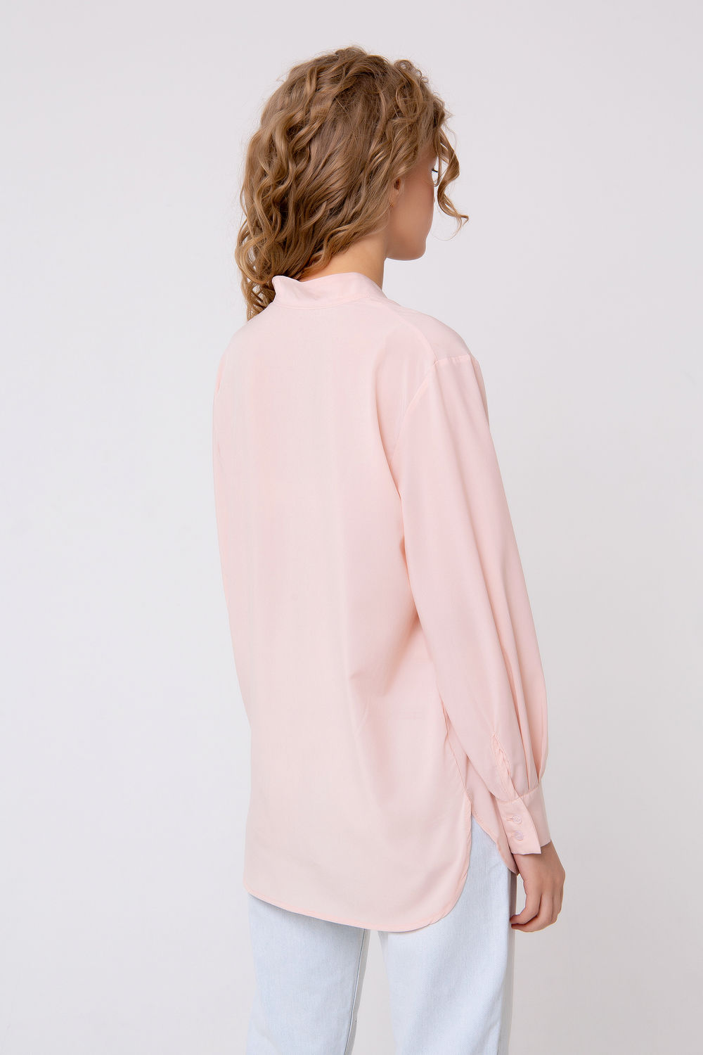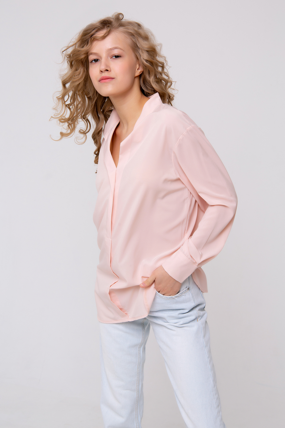 Эффектная блуза прямого кроя. Выполнена в пастельном персиковом цвете. Вырез горловины V-образный, рубашечного типа. Имитация суппатной застежки. Изделие дополнено небольшими боковыми разрезами, а также лёгкой асимметрией по спинке. Такая модель составит эффектную комбинацию с кожаными лосинами или узкими брюками. Состав: ниагара/100% полиэстер. Длина изделия 80 см. Рост модели на фото 173 см. Цвет: персик; Материал: ниагара;ниагара; Состав: 100% полиэстер.