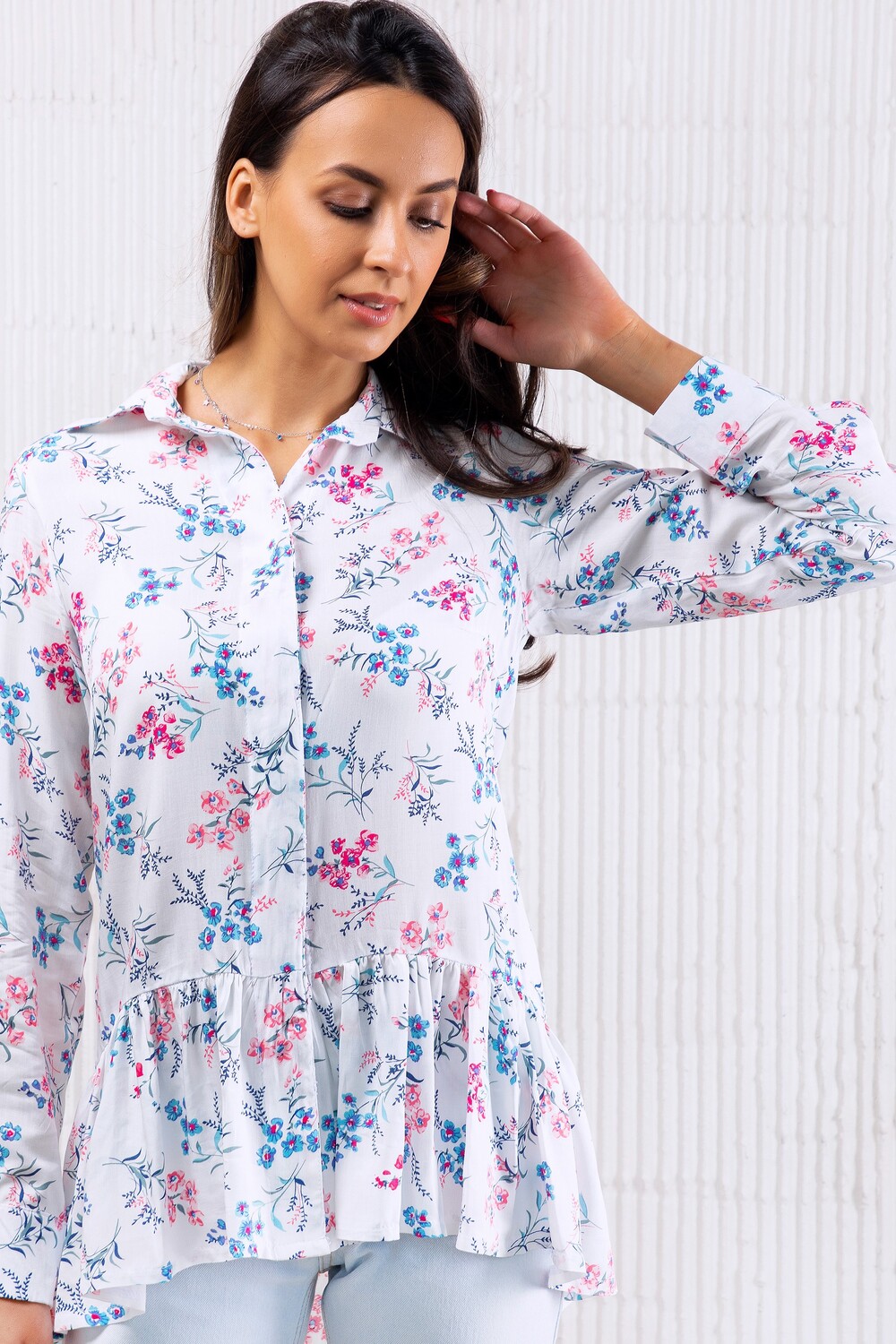 Блузка женская нарядная от бренда Raposa - незаменимый базовый предмет Вашего летнего гардероба! Нежнейший цветочный принт, струящаяся ткань, свобода в каждом движении - это все, что нужно жарким летом. Модель блузки с баской, с длинным рукавом придаст женственность вашему летнему наряду. Изысканная штапельная блузка в романтическом стиле легко сочетается с прямой юбкой или брюками. Представлена небольшими размерами с 40 до 48 и прекрасно подойдёт стройным девушкам и девочкам подросткам, для школы, на 1 сентября.