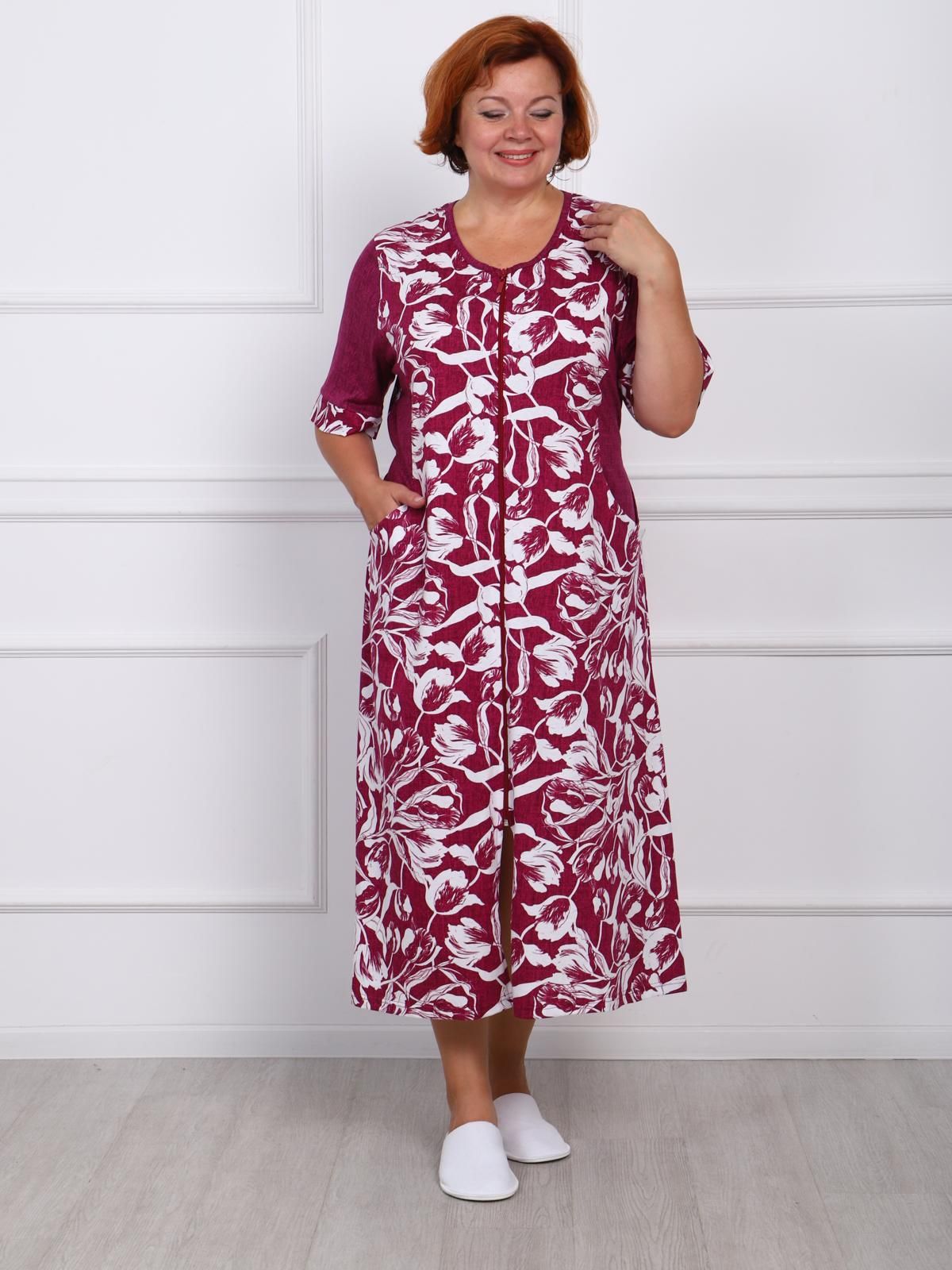 Удлиненный женский халат на молнии  с рельефами на груди и внутренними карманами. Рукав выполнен с манжетами.