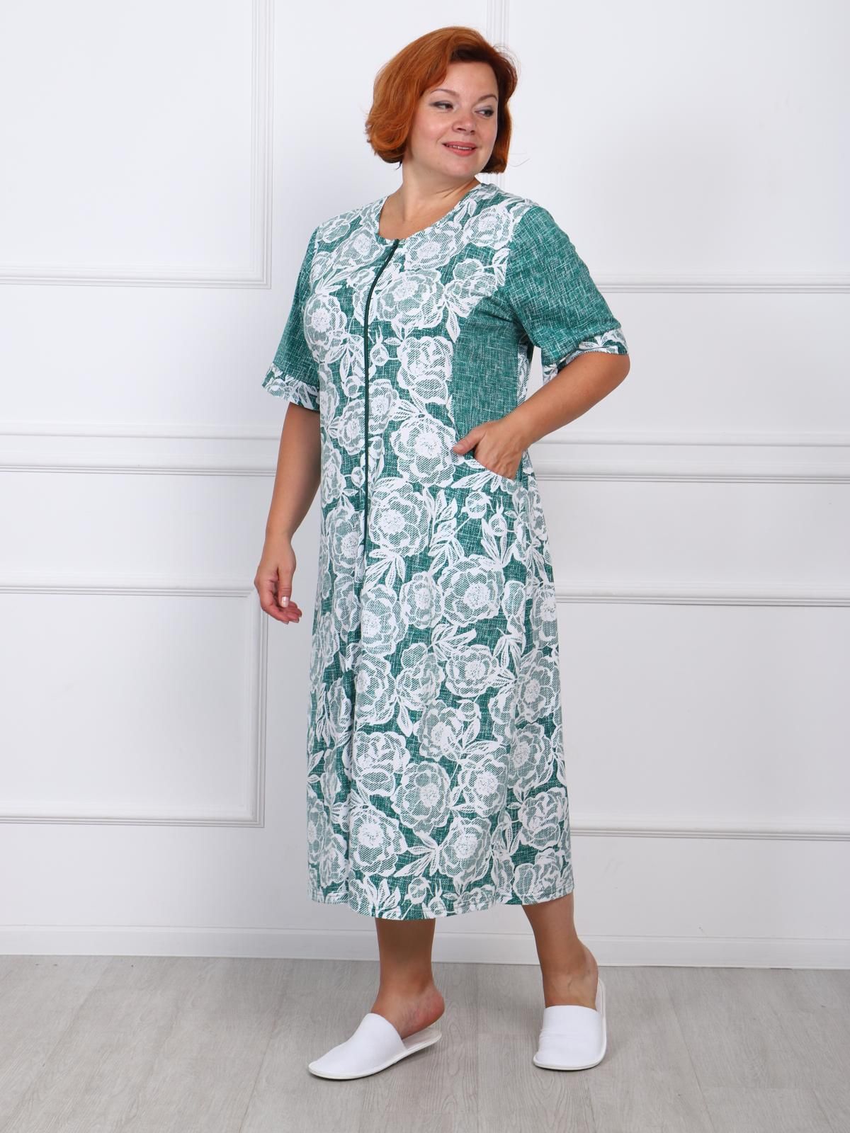 Удлиненный женский халат на молнии  с рельефами на груди и внутренними карманами. Рукав выполнен с манжетами.