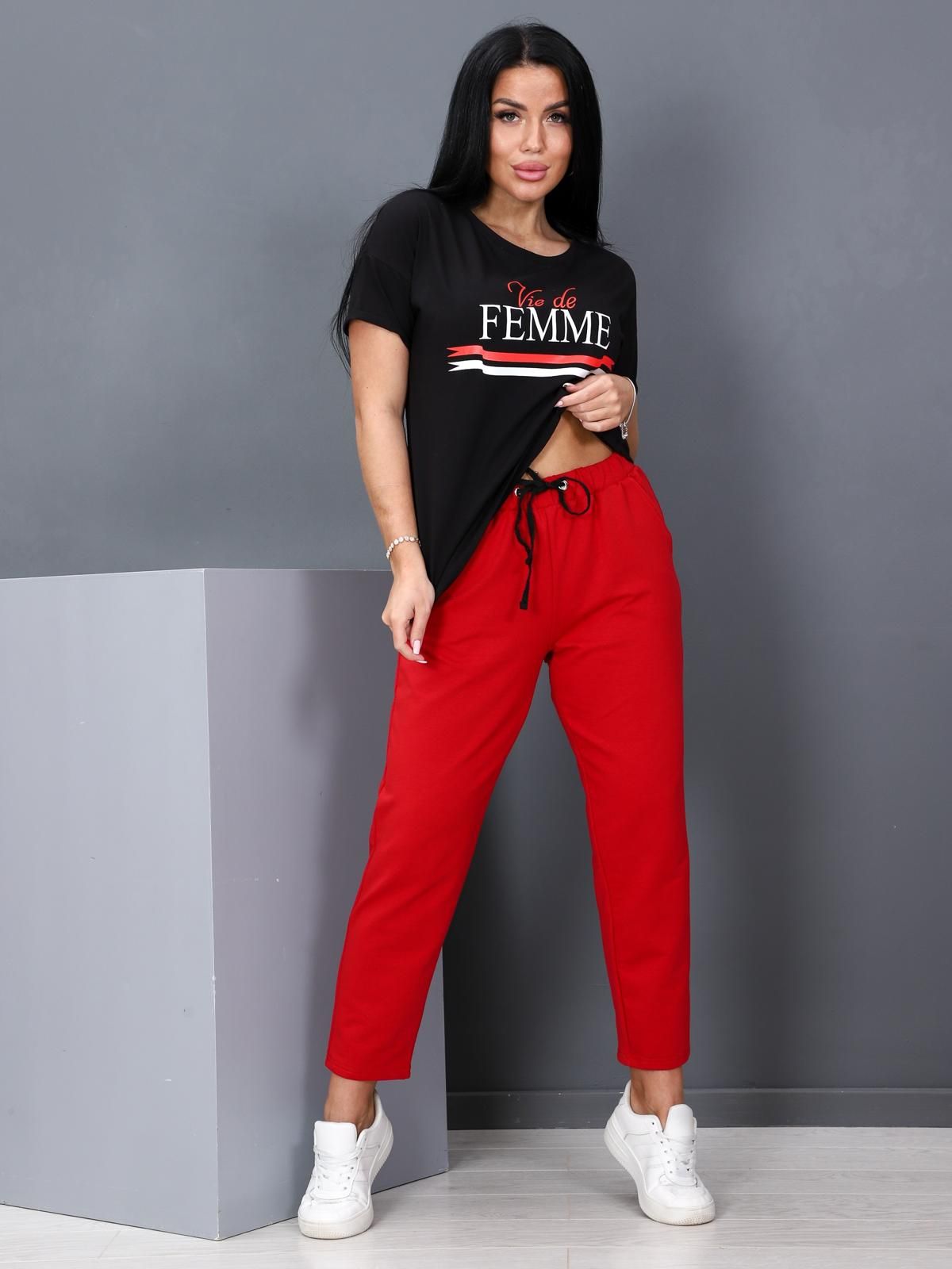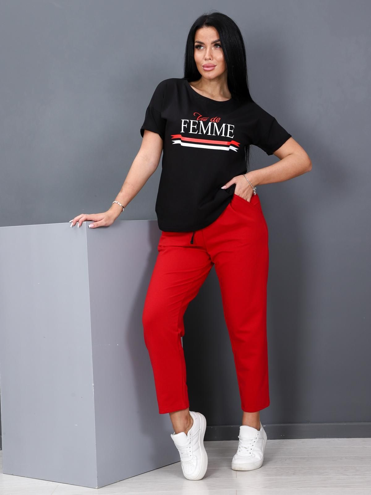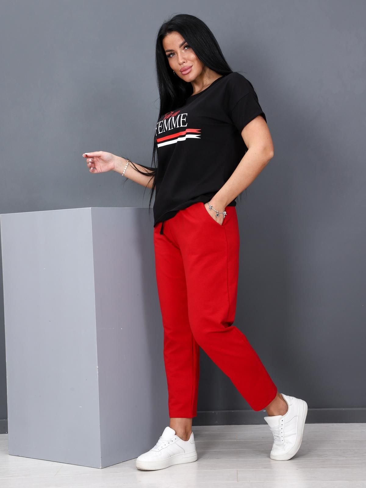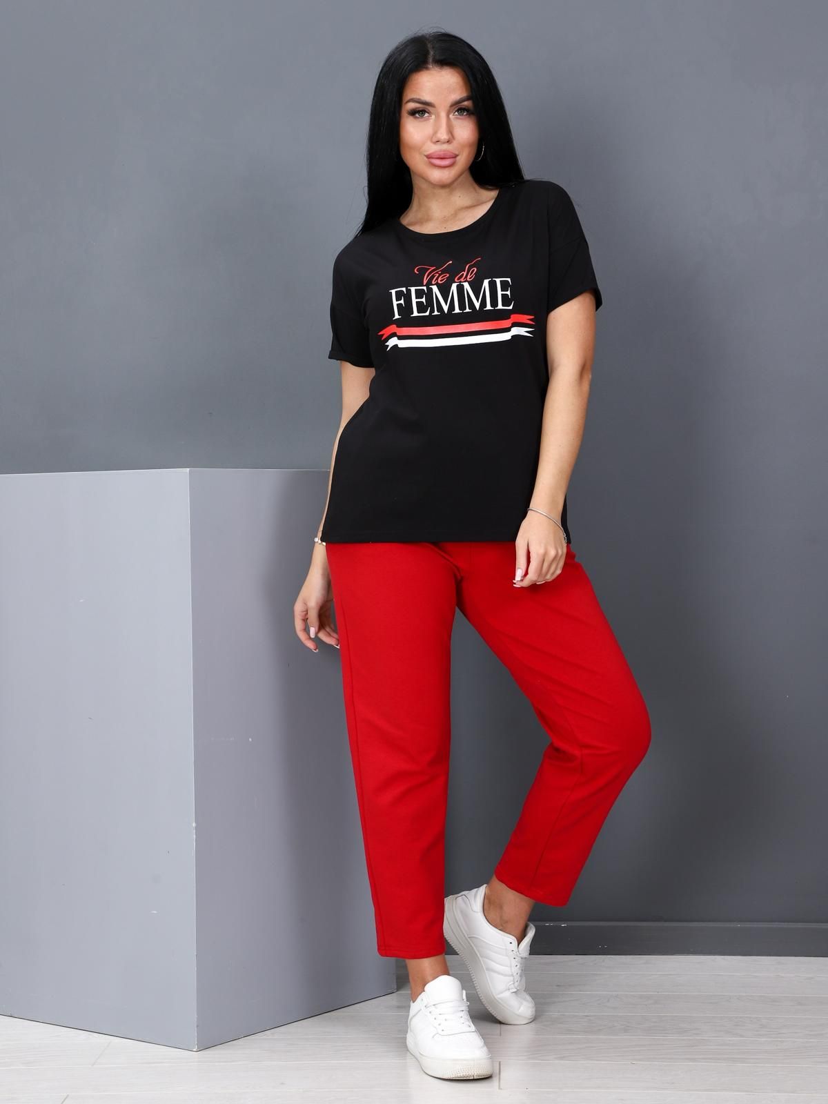 Костюм состоит из футболки и брюк. Футболка прямого силуэта  со спущенной линией плеча и круглым вырезом горловины. По центру полочки яркий принт. Брюки длиной 7/8, верх на эластичной тесьме, в боковых швах карманы.