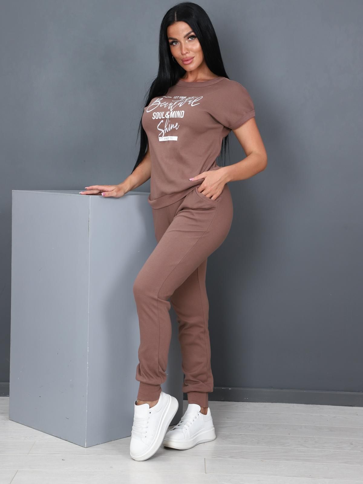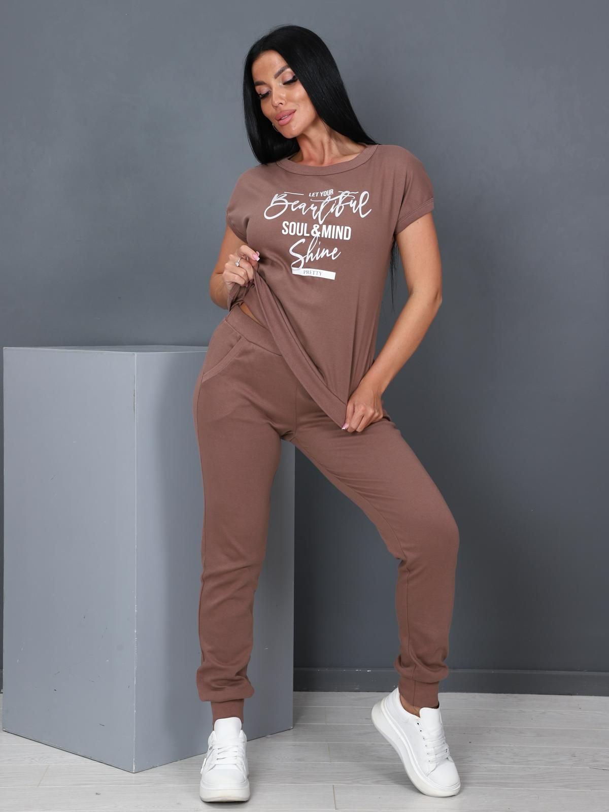 Костюм женский трикотажный. Состоит из футболки со спущенным плечом и брюк на манжетах по низу. Горловина , проймы, пояс футболки, а также отрезной пояс брюк, манжеты и входы в карманы выполнены из рибаны с лайкрой в цвет основной ткани. На изделии верха расположен принт-шелкография серебристого и белого оттенков.