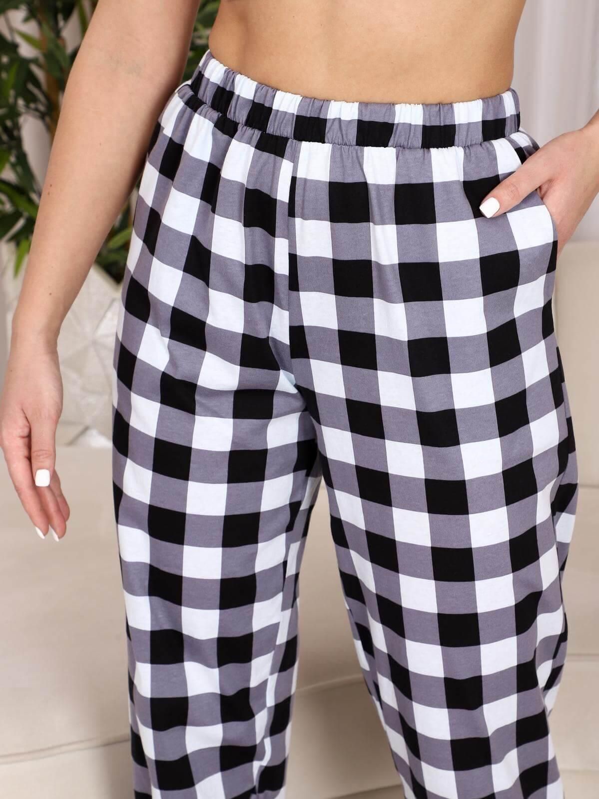 Женские брюки выполнены из трикотажного полотна "кулирка". Свободные брюки длиной 7/8, в боковых швах брюк находятся карманы,пояс брюк на эластичной тесьме, брюки заужены к низу вытачками по передней и задней частям и обработаны обтачкой с имитацией запаха.