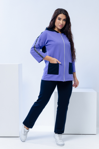 Костюм женский с брюками выполнен из ткани футер 2-нитка качества пенье. Кофта с капюшоном, на серебристой молнии, с двумя накладными карманами, спущенный рукав 3/4. На рукавах пришита декоративная тесьма с люрексом. Брюки на поясе с карманами. Костюм идеально подойдет для прогулок, спорта и отдыха.