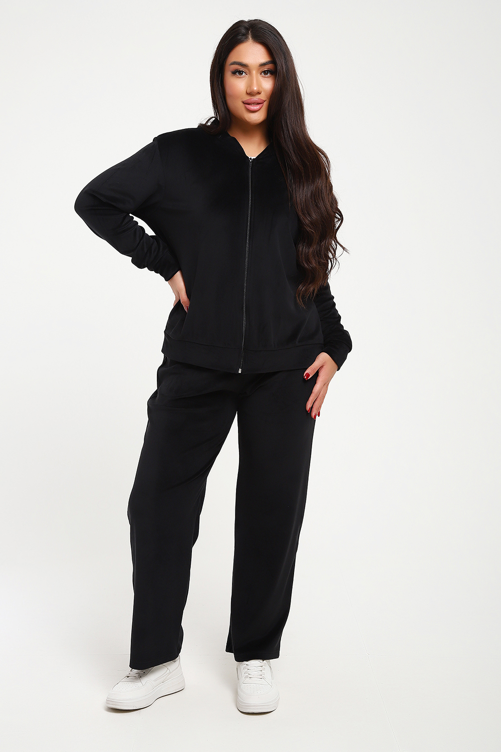 Костюм женский из мягкого велюра состоит из брюк и бомбера. Брюки имеют идеальную посадку, бомбер свободного кроя. Костюм идеально подойдет как для дома, так и для отдыха и прогулок.