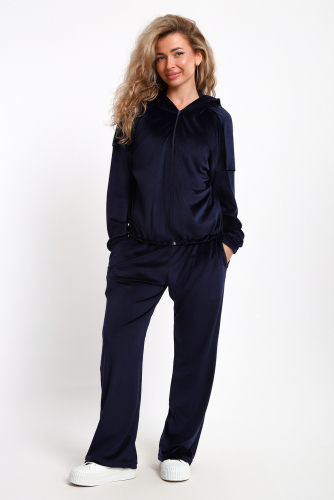 Костюм женский велюровый состоит из толстовки на молнии и брюк. Толстовка с глубоким капюшоном, по низу утягивающий шнур с фиксаторами, рукав спущенный с манжетом, брюки прямые с карманами. Костюм мягкий, удобный, отлично подойдет для дома, прогулок и отдыха.