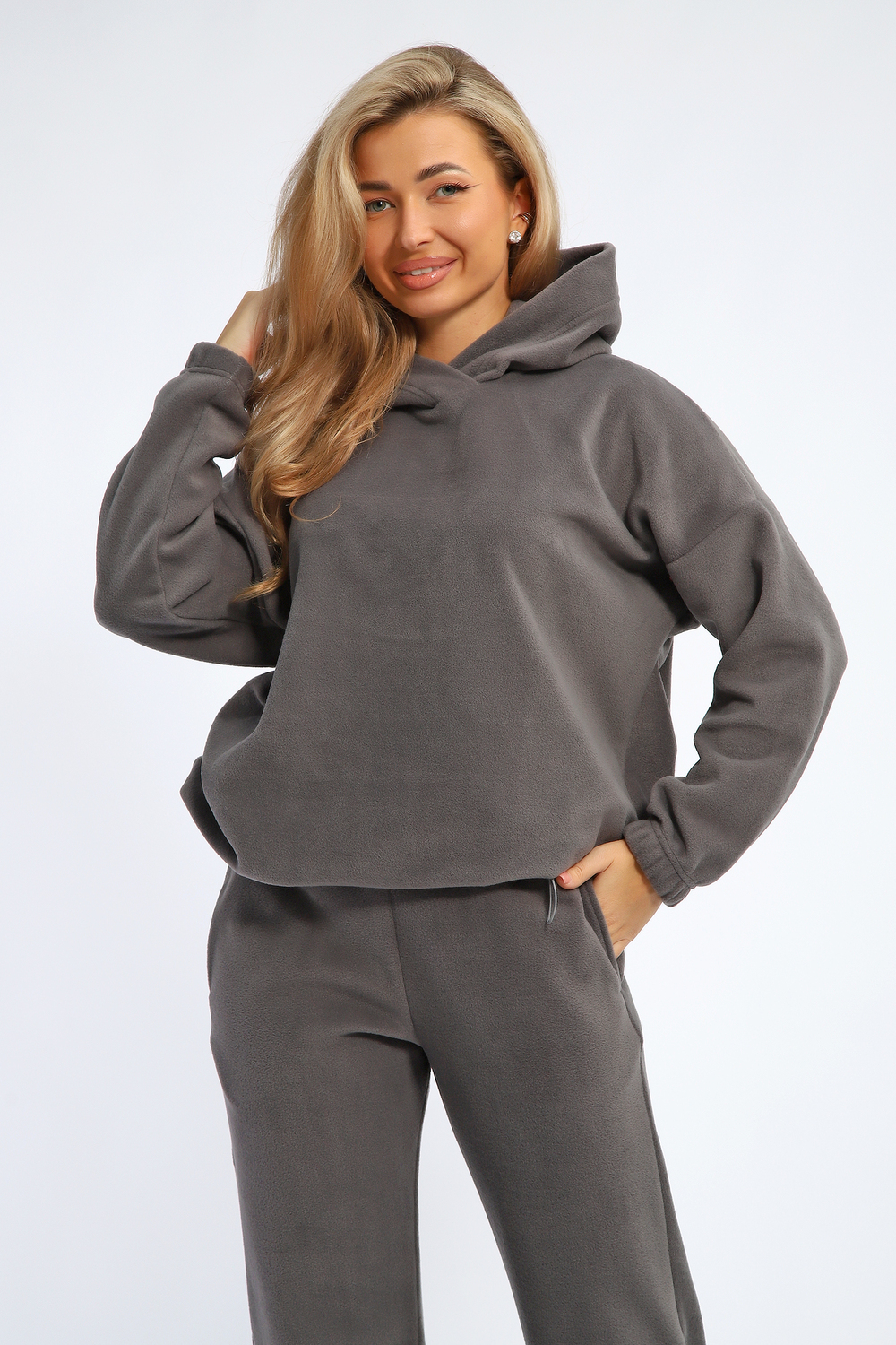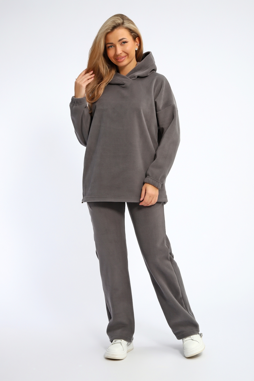Костюм женский флисовый состоит из худи свободного кроя и брюк. Худи с капюшоном, рукав на резинке, по низу утягивается эластичным шнурком с фиксаторами. Брюки свободные, с карманами, внизу можно также утягивать эластичным шнурком с фиксаторами. Костюм мягкий, комфортный, отлично подойдет для прогулок в прохладное время года. Цвет: серый;коричневый;темно-синий; Материал: флис; Состав: 100%ПЭ.