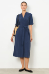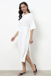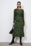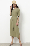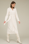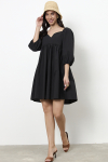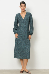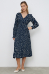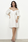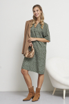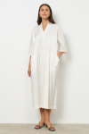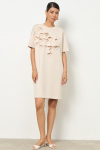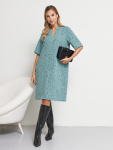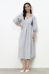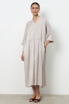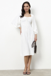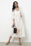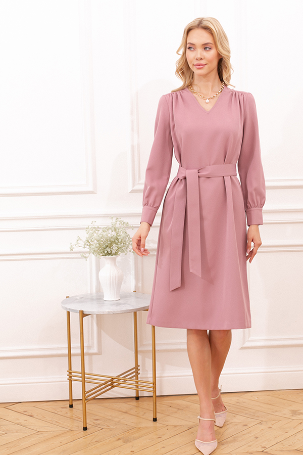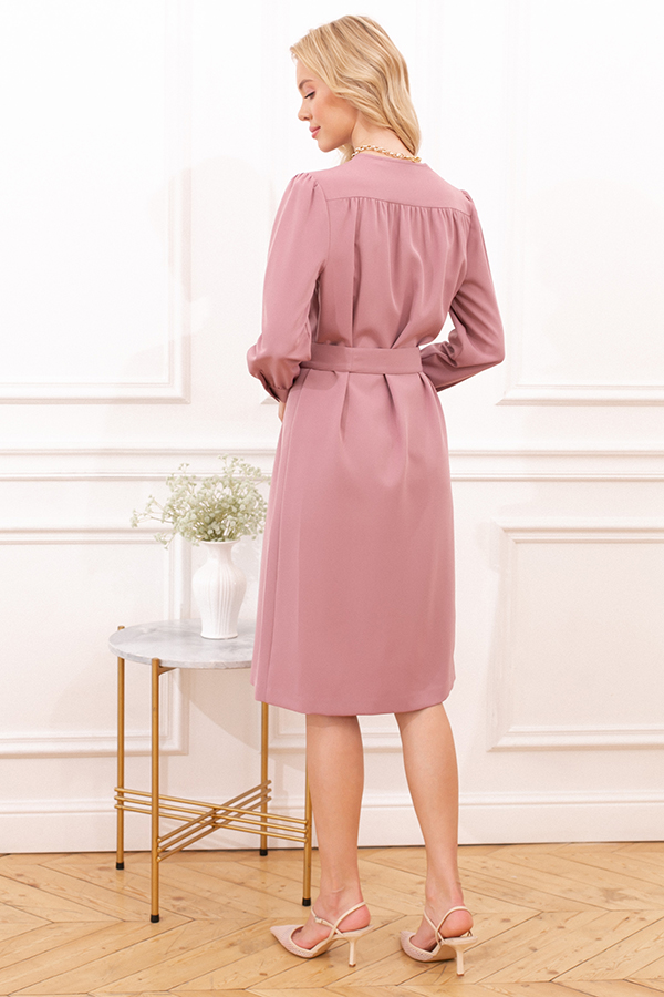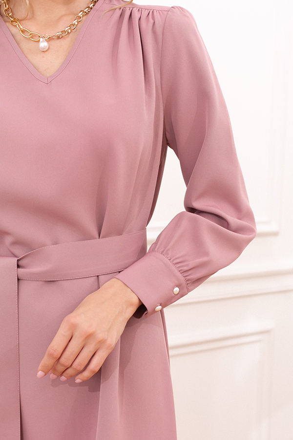 Платье свободного силуэта из плательной ткани. Втачной рукав со сборкой по окату, низ рукава на манжете с застёжкой на пуговицы-жемчужины. V-образный вырез горловины обработан косой бейкой. На передней части и задней части выполнены кокетки с романтичной сборкой.