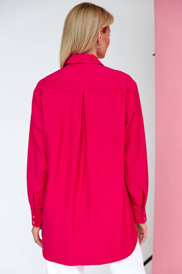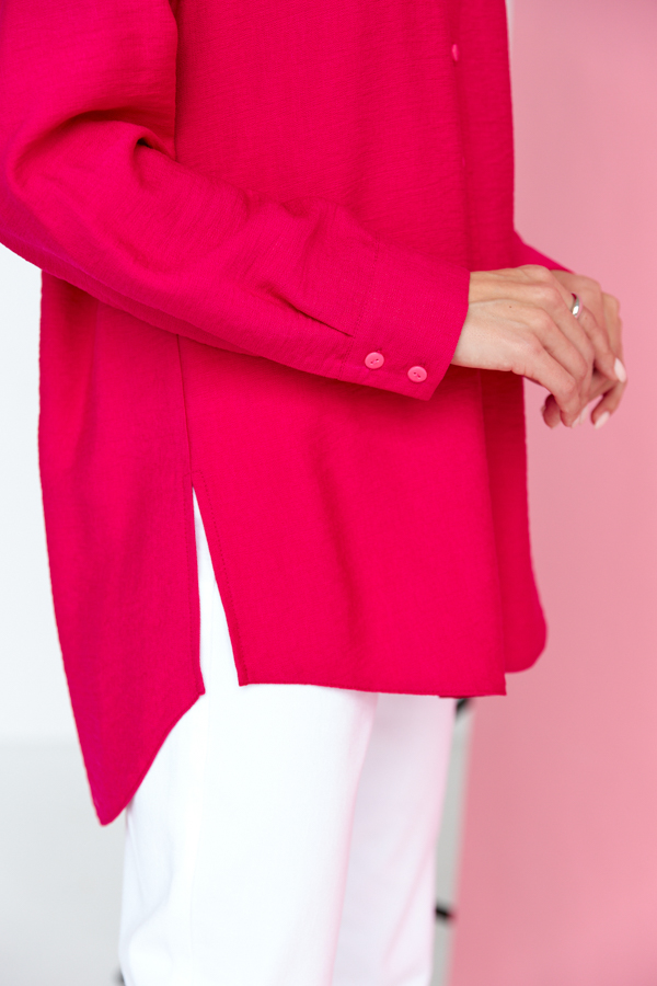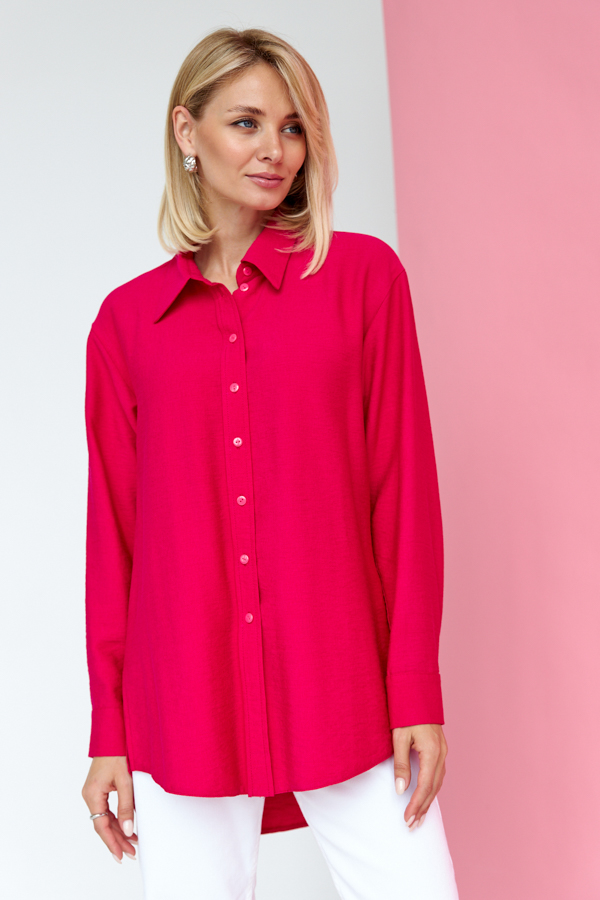 Рубашка из вискозной ткани с крэш-эффектом. Свободный силуэт с застёжкой на планке. Низ изделия асимметричной длины (спинка удлинена относительно переда) с закруглениями по бокам. Вырез горловины обработан отложным воротником на стойке. Рубашечный рукав на манжете с застёжкой на пуговицы. На задней части изделия выполнена кокетка с небольшой складкой. Достоинство этой модели - в способности скрыть некоторые недостатки фигуры. Её можно сочетать как с брюками, так и с джинсами.