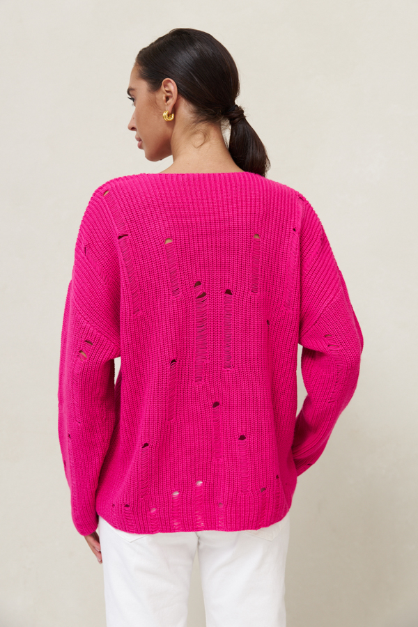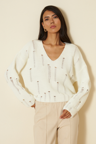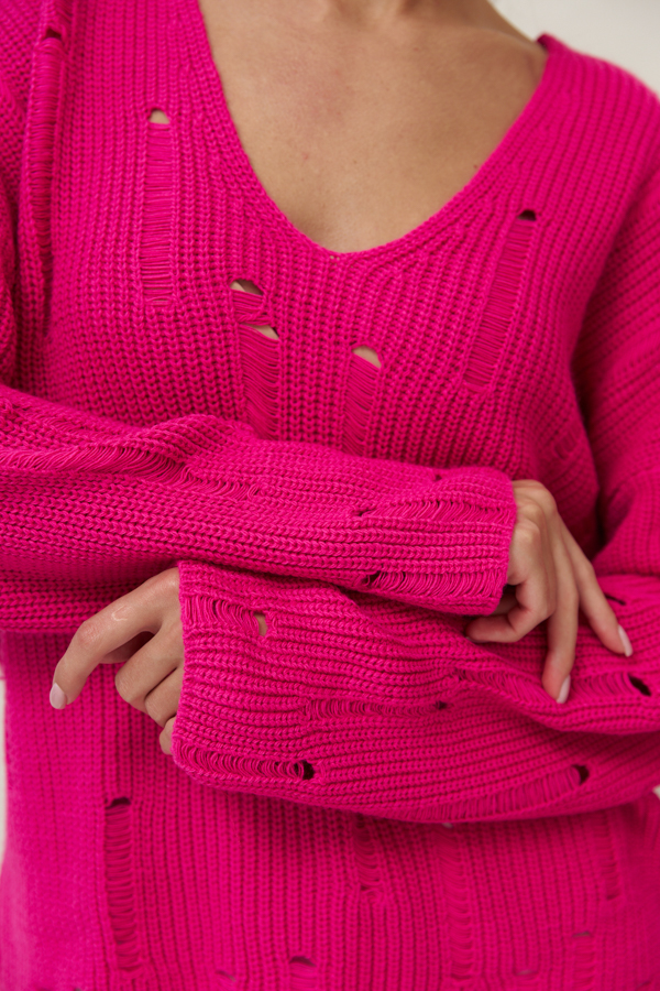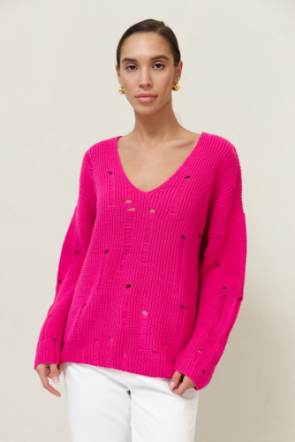 Оригинальный джемпер свободного силуэта с фактурой «жемчужный узор». Изделие со спущенной линией плеча и длинным рукавом. V-образный вырез горловины. Изделие выполнено из мягкой структуриванной пряжи.