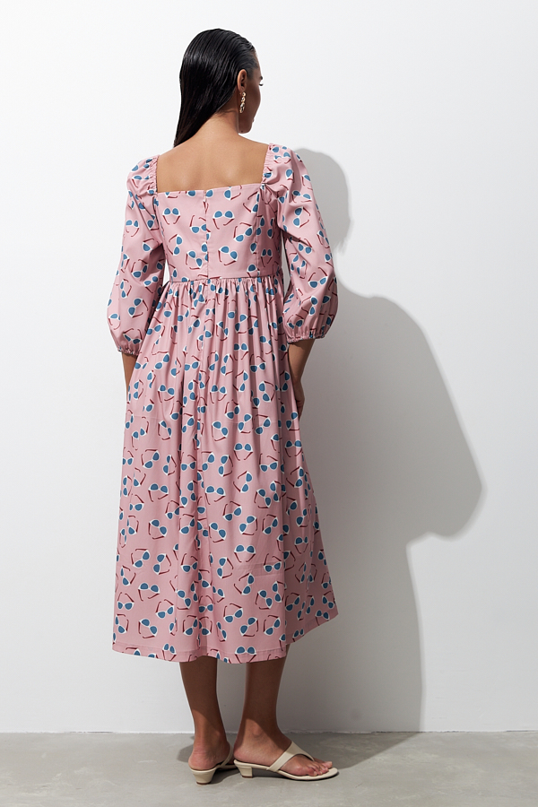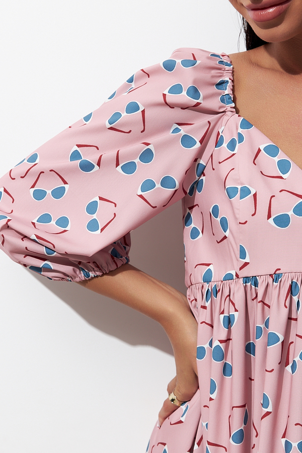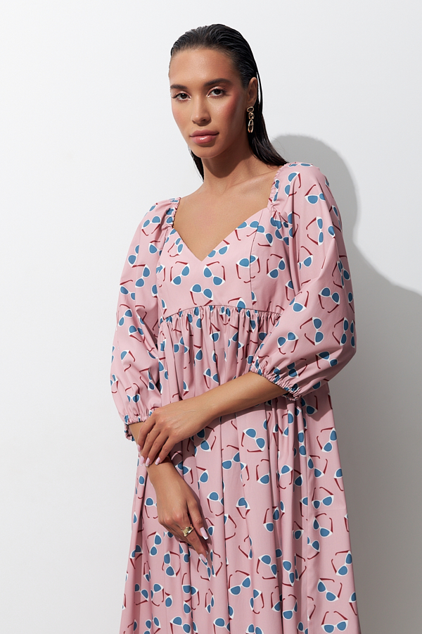 Платье свободного силуэта из вискозной ткани. Изделие отрезное по линии талии. Линия талия завышена и фигурная. Верхняя часть юбки со сборкой. По среднему шву спинки потайная молния. Лиф переда и спинки двухслойный, имеет рельефные швы. Окат рукава и низ рукава зафиксированы резиной.