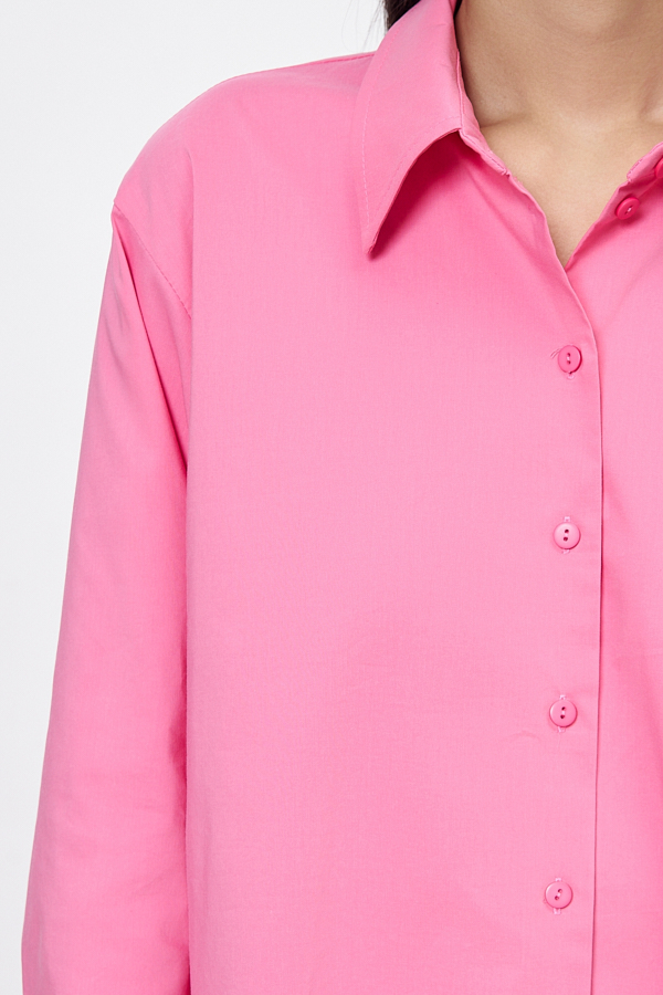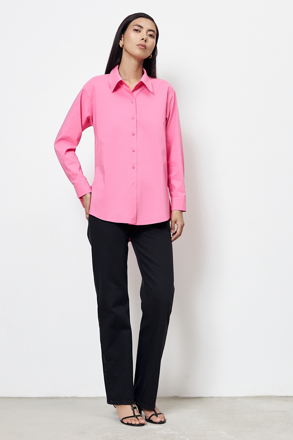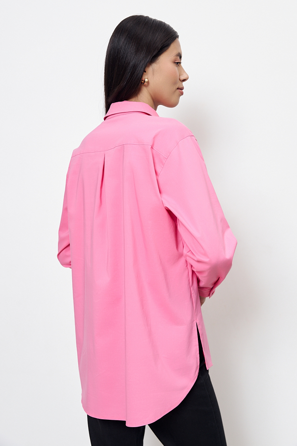 Рубашка из хлопковой ткани свободного силуэта с застёжкой на пуговицы. Низ изделия асимметричной длины (спинка удлинена относительно переда) с закруглениями по бокам. Вырез горловины обработан отложным воротником на стойке. Рубашечный рукав на манжете с застёжкой на пуговицы. На задней части изделия выполнена кокетка с небольшой складкой. Достоинство этой модели - в способности скрыть некоторые недостатки фигуры. Её можно сочетать как с брюками, так и с джинсами.