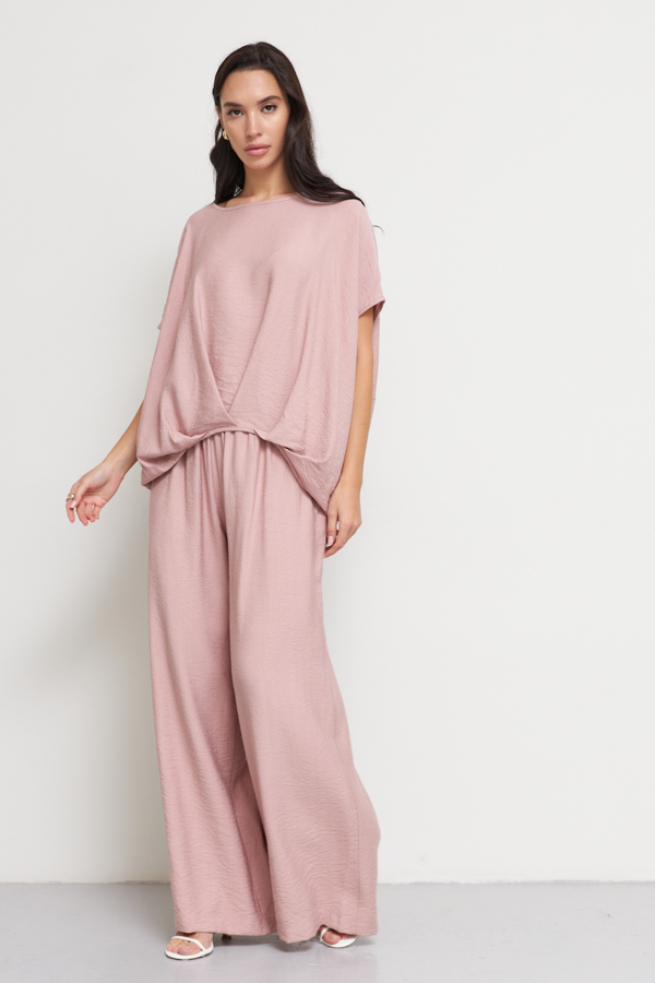 Блуза из вискозной ткани с крэш-эффектом. Свободный крой асимметричной длины (спинка удлинена относительно переда). Спущенное плечо. Линия проймы, линия горловина и низ изделия окантованы косой бейкой из основной ткани. Изюминкой являются оригинальные складки на передней и задней части изделия.