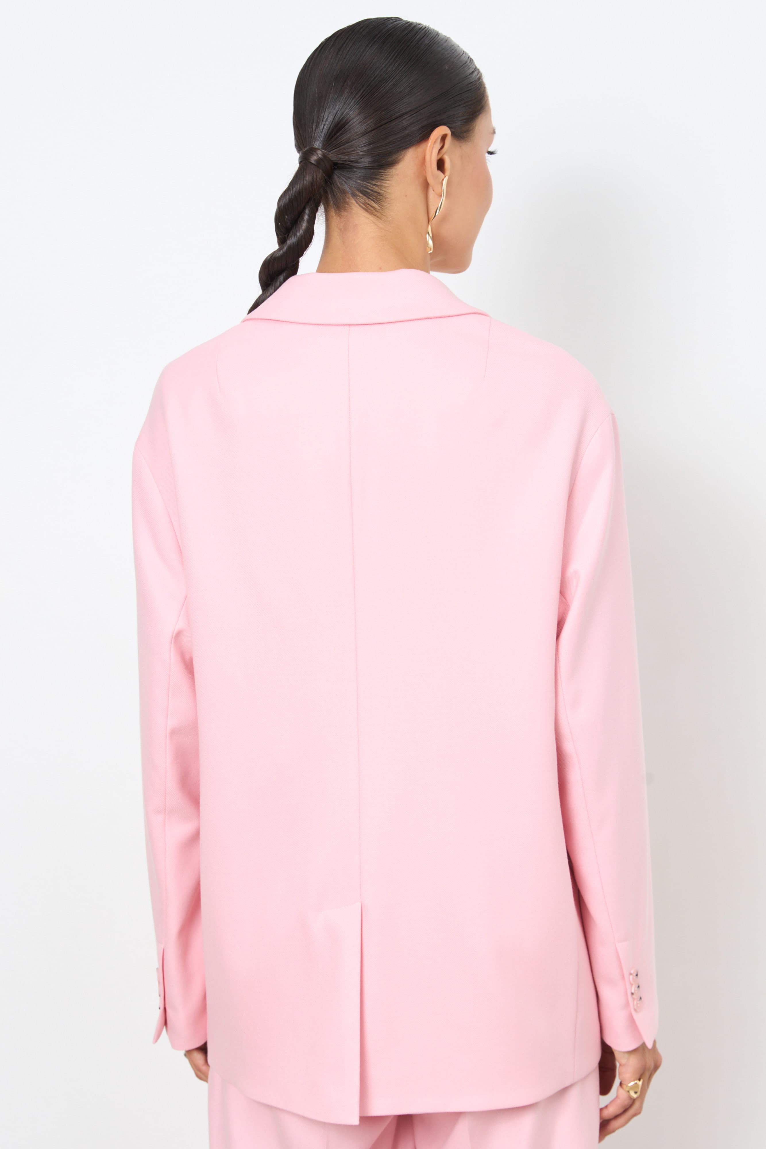 Жакет из костюмной ткани полуприлегающего силуэта. Изделие с английским воротником и застежкой на пуговицы. На передней части жакета выполнены карманы в рамку с клапанами. По центру спинки выполнена шлица — элемент, одновременно декоративный и функциональный. Рукав длинный, снизу — имитация шлицы с пуговицами. Жакет на подкладке.