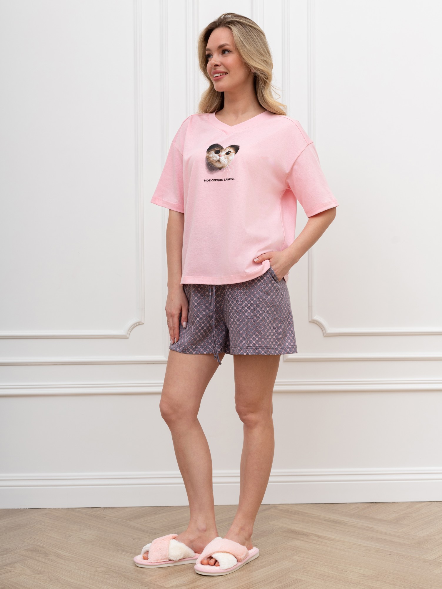 Костюм женский из трикотажного полотна «кулирка» в комбинации двух видов: с набивным рисунком и гладкокрашенного в единой цветовой гамме, состоящий из футболки и шорт.Футболка - из гладкокрашеного полотна, классического покроя, с короткими втачными рукавами, горловиной V- образной формы и принтом на полочке, выполненным в технике «шелкографии». Горловина обработана втачной планкой из основного материала.Шорты - из полотна с набивным рисунком, свободного покроя, укороченные, с карманами в боковых швах, на притачном поясе с эластичной тесьмой по талии и шнурком, продетым в две обметанные петли.