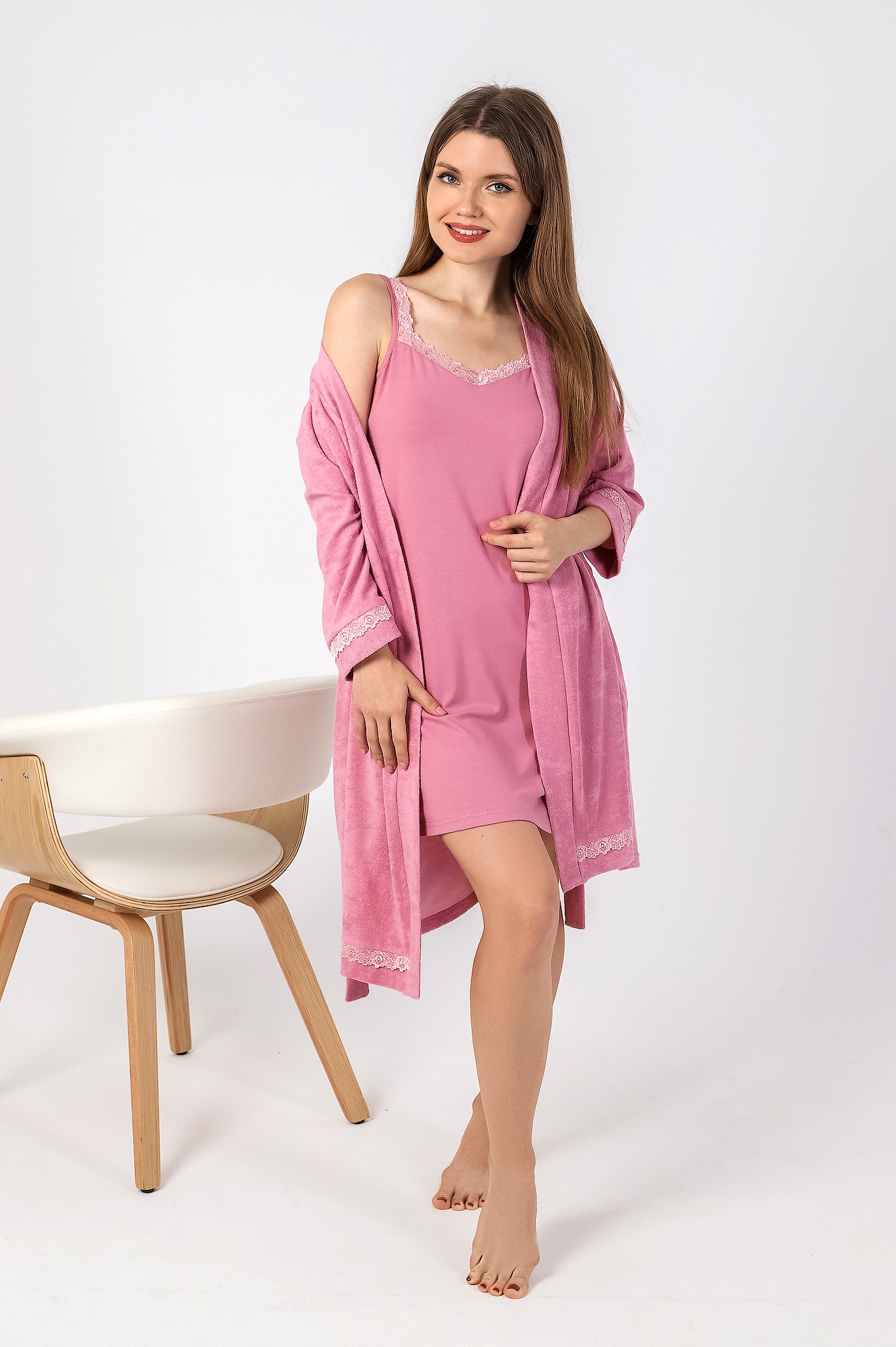 Ночная сорочка из гладкокрашеного вискозного трикотажного полотна, свободного покроя, слегка расширенная книзу, без рукавов. На полочке притачные кокетки, выполненные из кружева и образующие v-образный вырез горловины. Проймы, кружевные бретели и верхний срез спинки окантованы основным материалом.