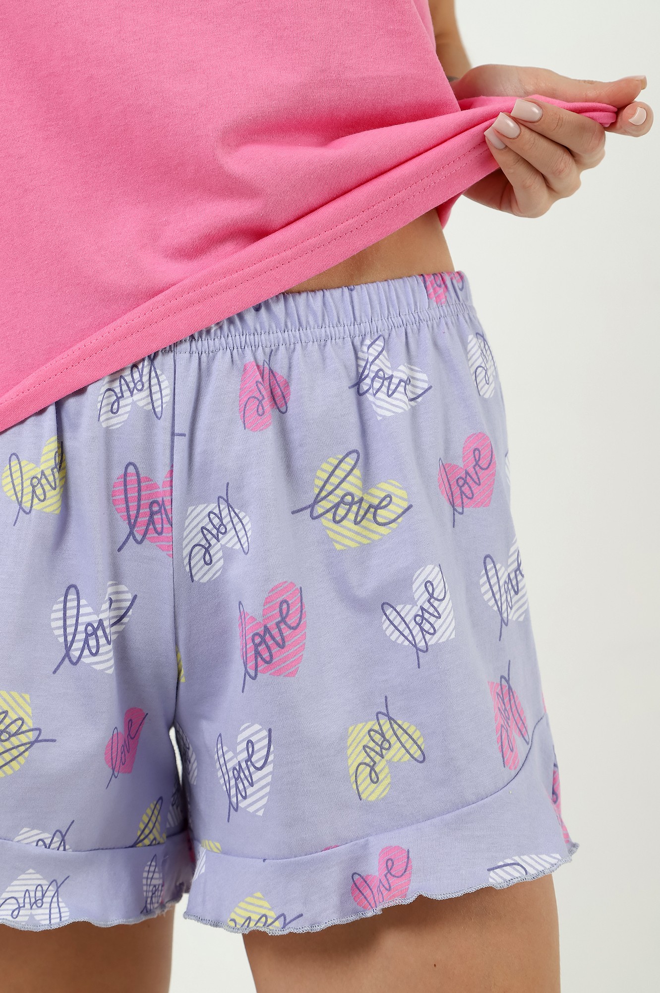 Пижама молодежная из трикотажного полотна «кулирка» в комбинации двух видов: гладкокрашеного и с набивным рисунком, состоящая из майки-топа и шорт. Майка-топ – из гладкокрашенного полотна, на узких бретелях, с принтом на полочке, выполненным в технике «шелкографии».Шорты – свободного покроя, с эластичной тесьмой по талии. К нижним срезам шорт притачаны воланы и обработаны узкой обметочной строчкой, создающей волнообразный край.