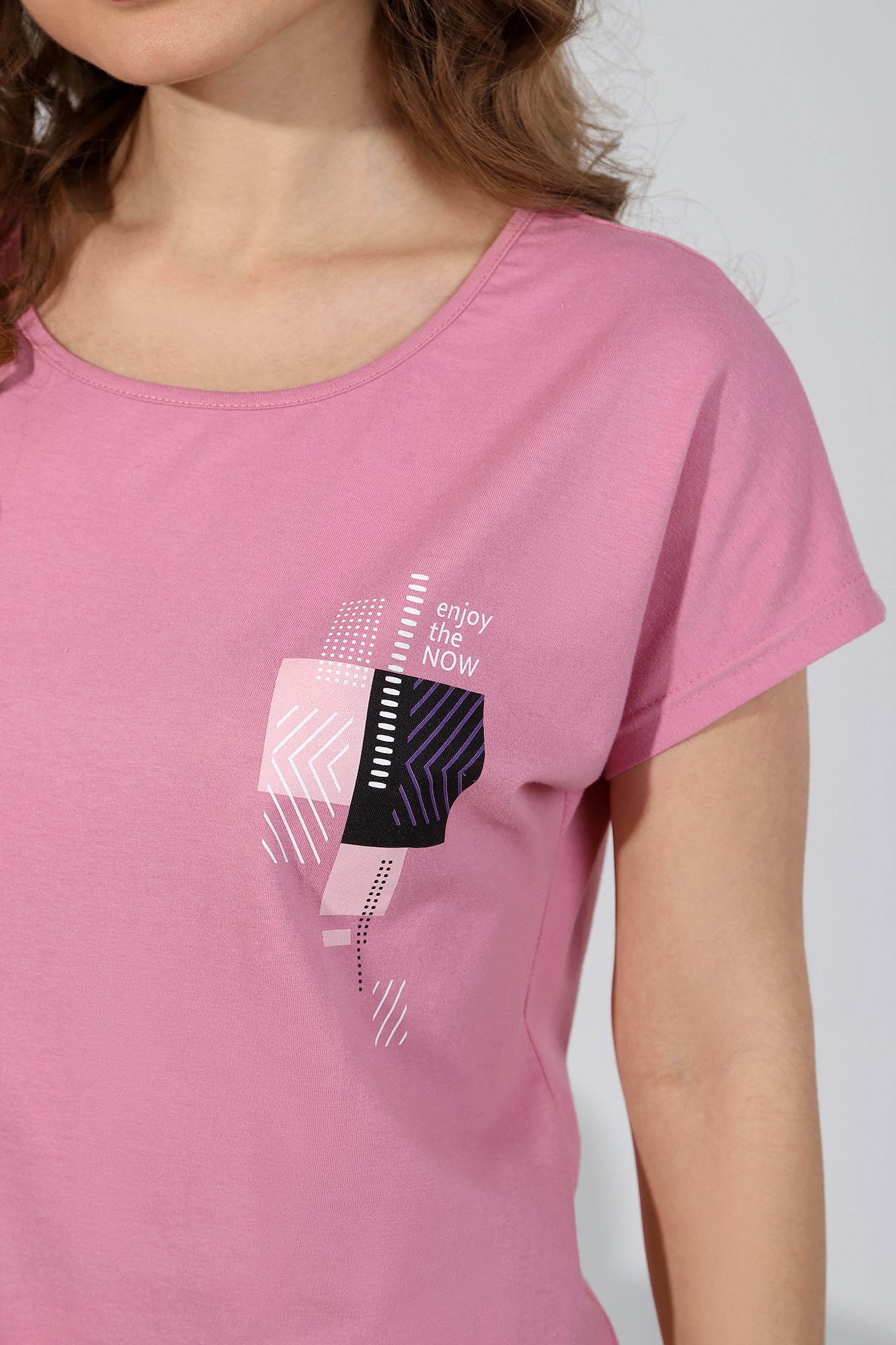 Футболка – из гладкокрашеного полотна, с короткими цельнокроеными рукавами, горловиной овальной формы, окантованной основным материалом и принтом на полочке.