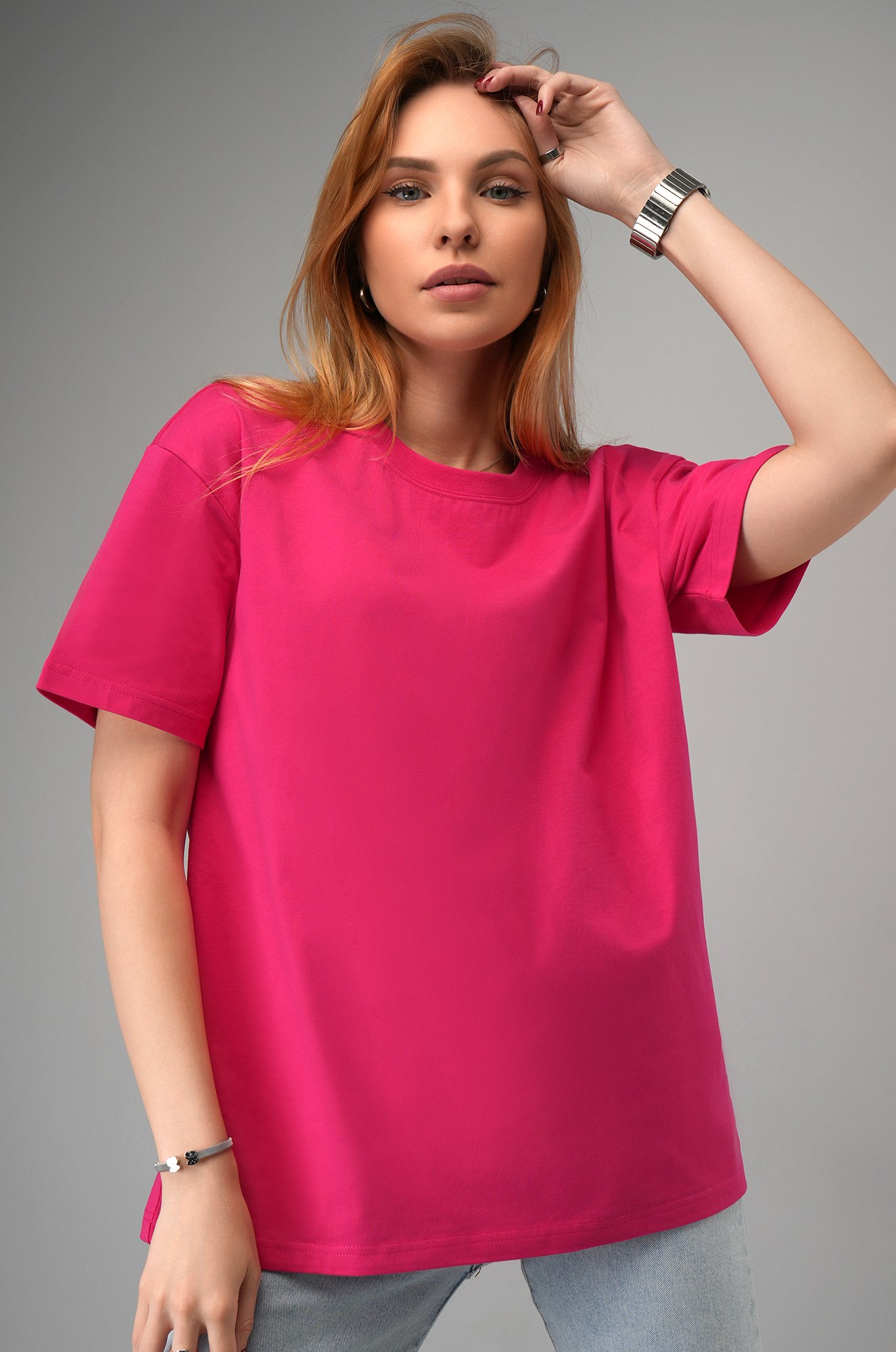 Женская футболка — яркое решение для повседневных образов. Розовая футболка оверсайз выполнена из 100% хлопка.