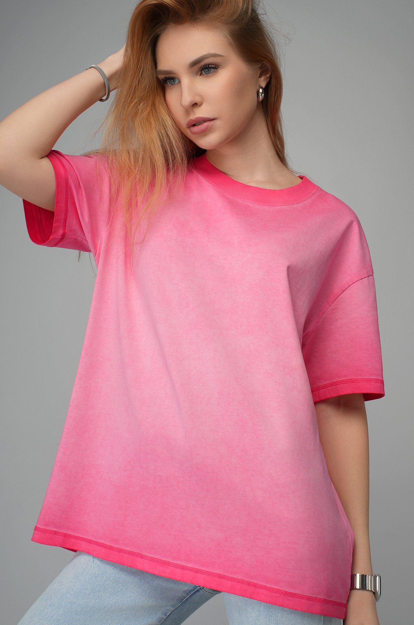 Женская футболка с варёным эффектом омбре — яркое и удобное решение для повседневных образов с настроением свободы. Розовая футболка оверсайз выполнена из 100% хлопка.