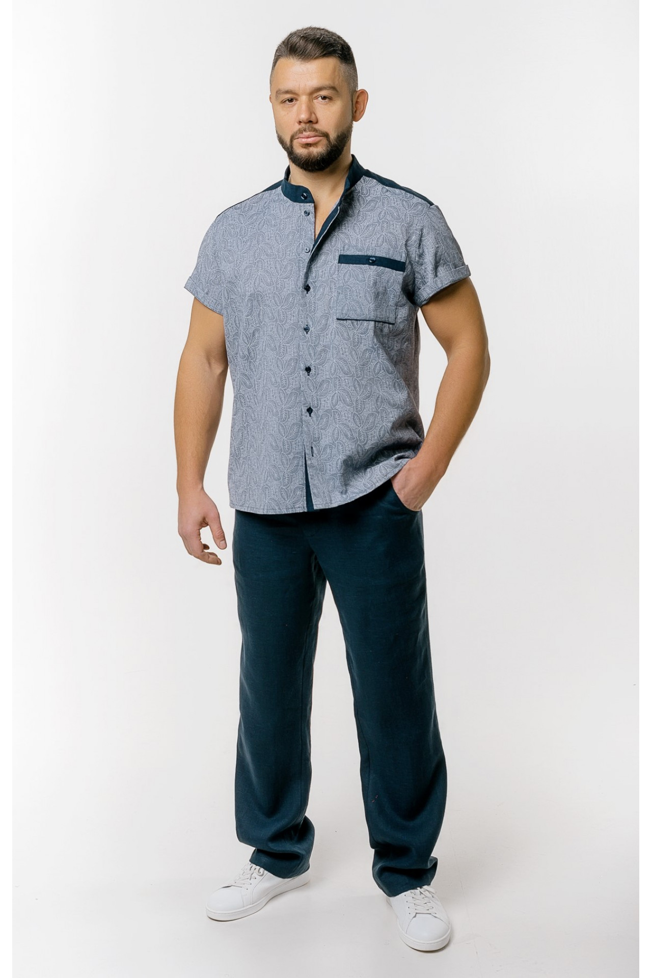 Оригинальная мужская рубашка, выполненная в сочетании принтованной х/б и однотонной льняной тканей. Силуэт свободный.