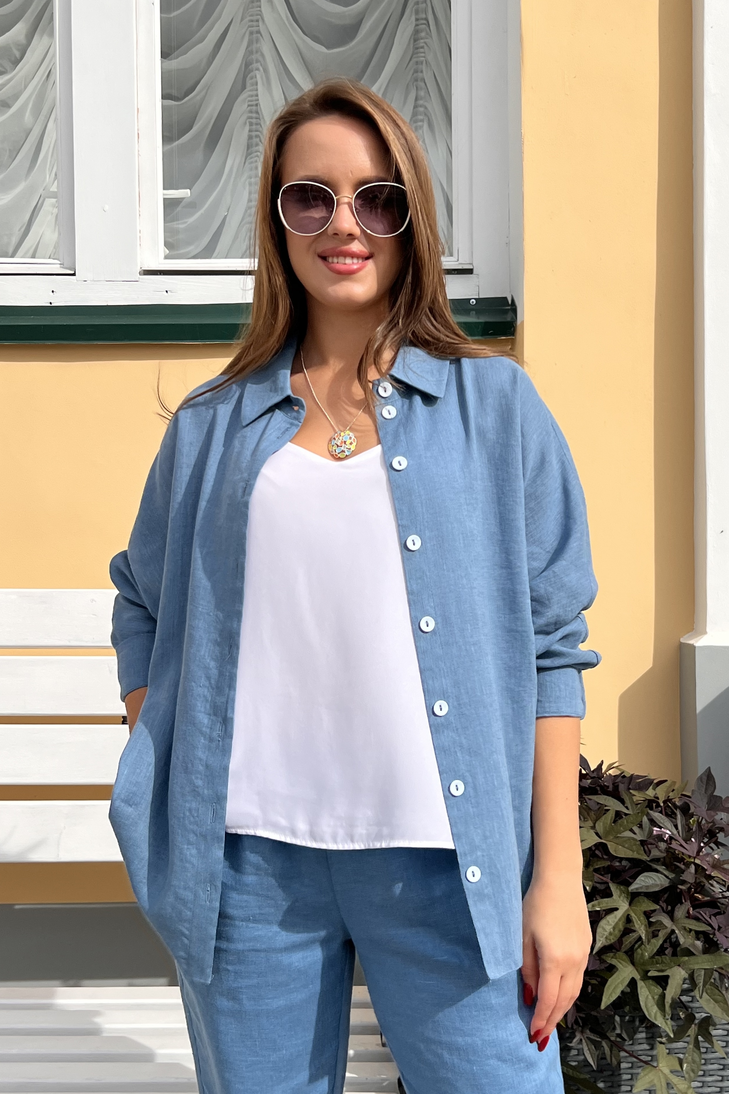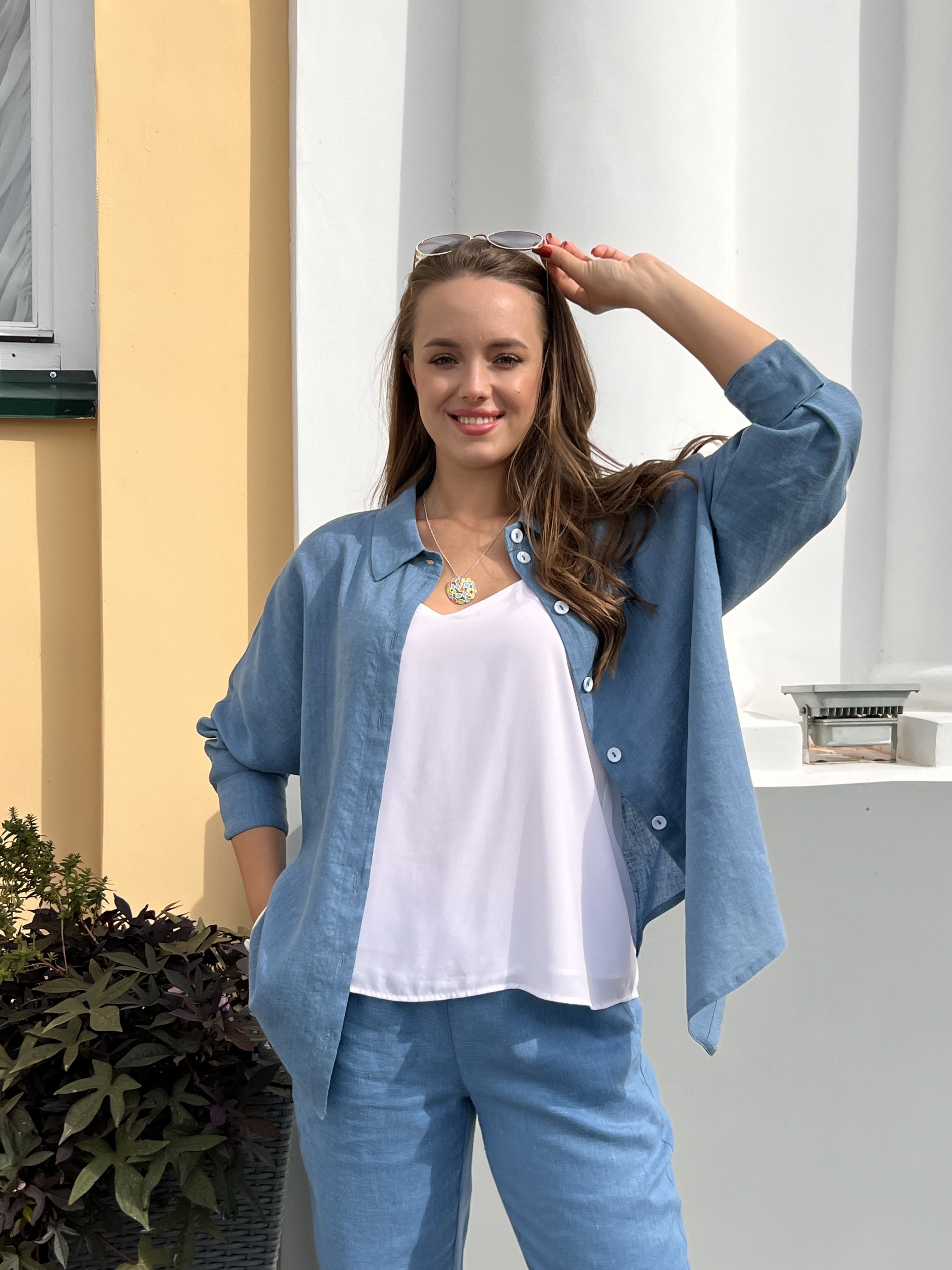 Свободная рубашка из полульняной ткани будет служить в качестве элемента костюма как 2-й слой, т.е. предполагается ее носить поверх топа, майки или сарафана, а также и как отдельный предмет в комплекте с брюками или юбкой.  Добавление нитей вискозы в льняную ткань делает вещь мягче и эластичней. Свободный силуэт с  цельнокроеным рукавом обеспечивает отличную посадку на фигурах большой полноты.
