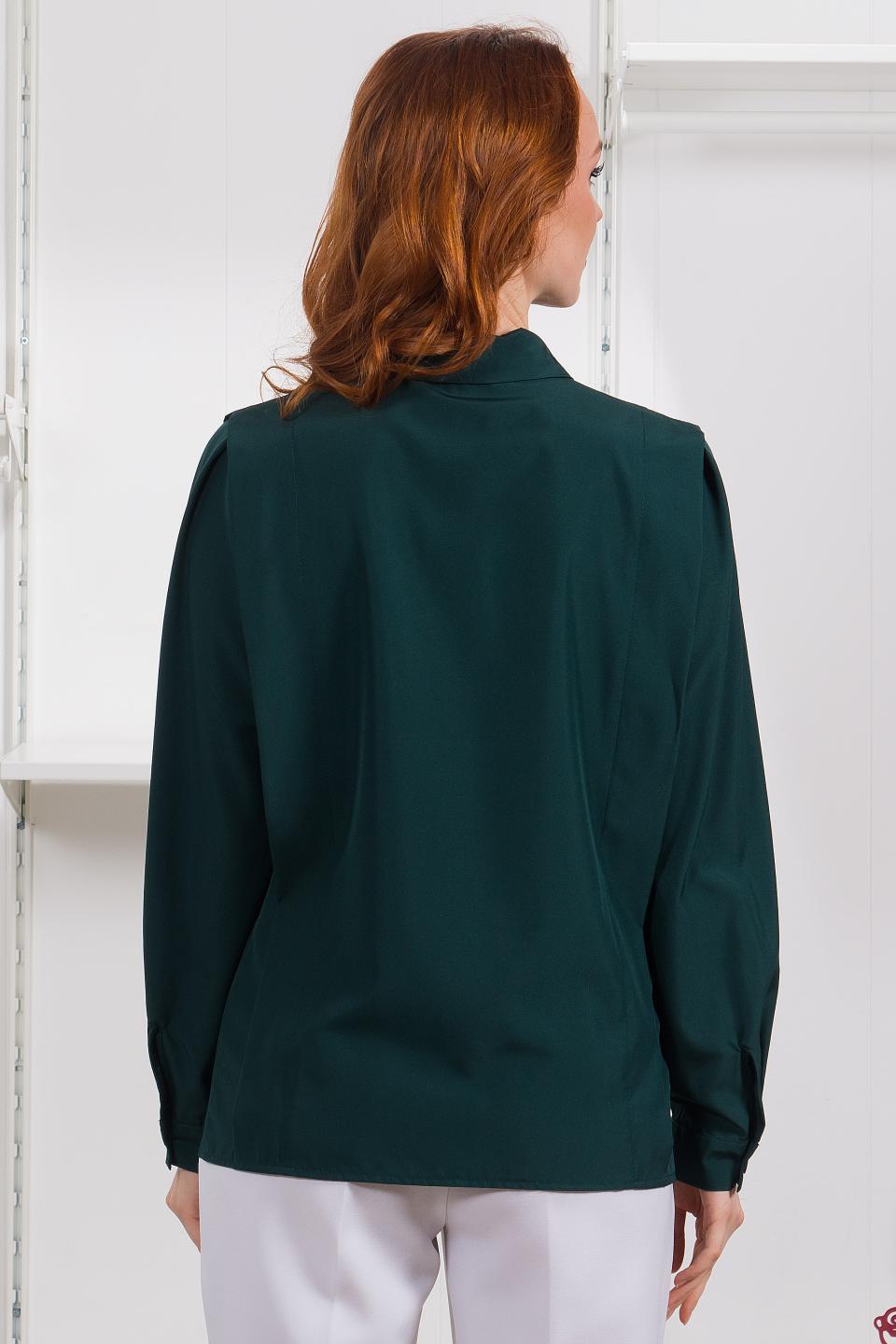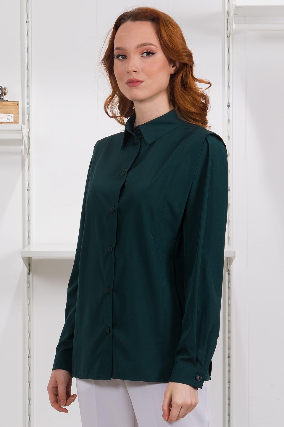 Описание: Вертикальные складки в рельефах рубашки, закрепленные по талии отделочными строчками, рисуют чёткий вытянутый силуэт. Встречная складка по окату рукава придаёт ему пышность и объем.