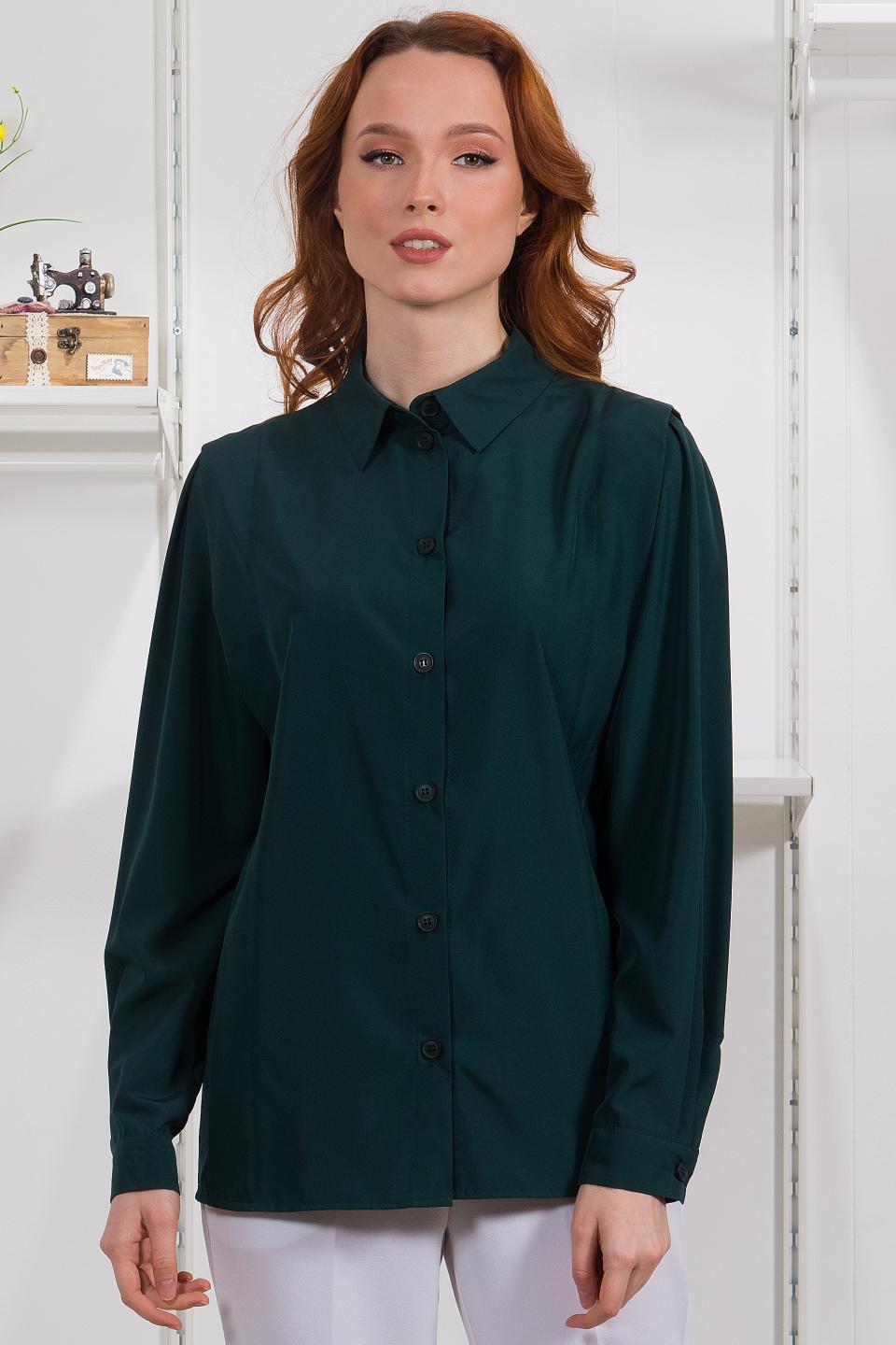 Описание: Вертикальные складки в рельефах рубашки, закрепленные по талии отделочными строчками, рисуют чёткий вытянутый силуэт. Встречная складка по окату рукава придаёт ему пышность и объем.
