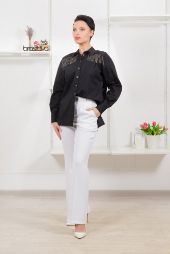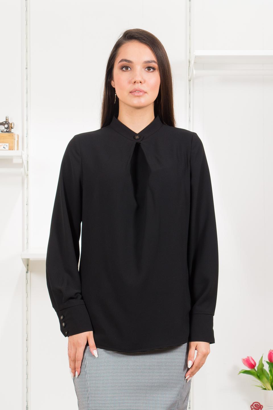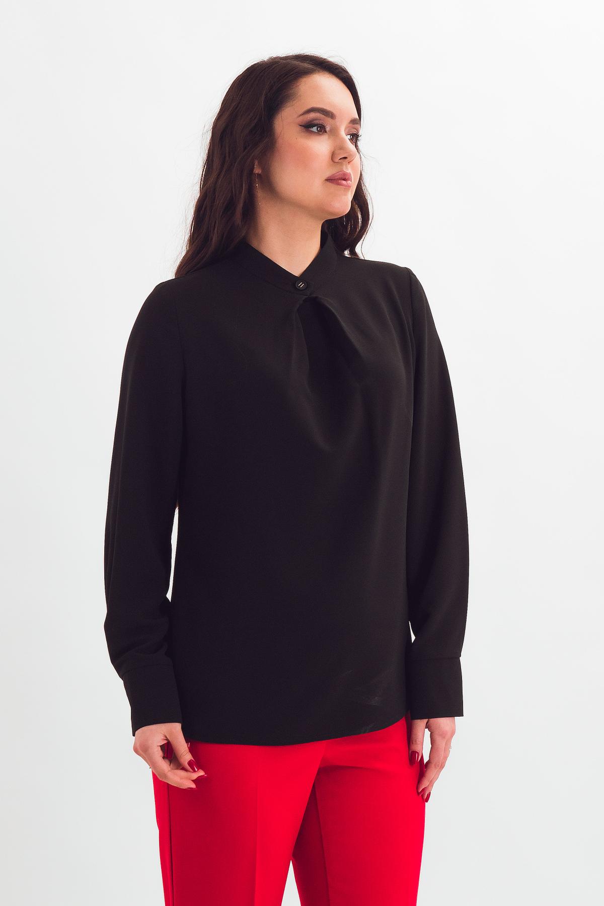 Описание: Строгое очарование- струящийся материал блузки подчеркнут фурнитурой, застежка на стойке с мягкими складками на грудь создает лаконичный образ в стиле тихой роскоши.