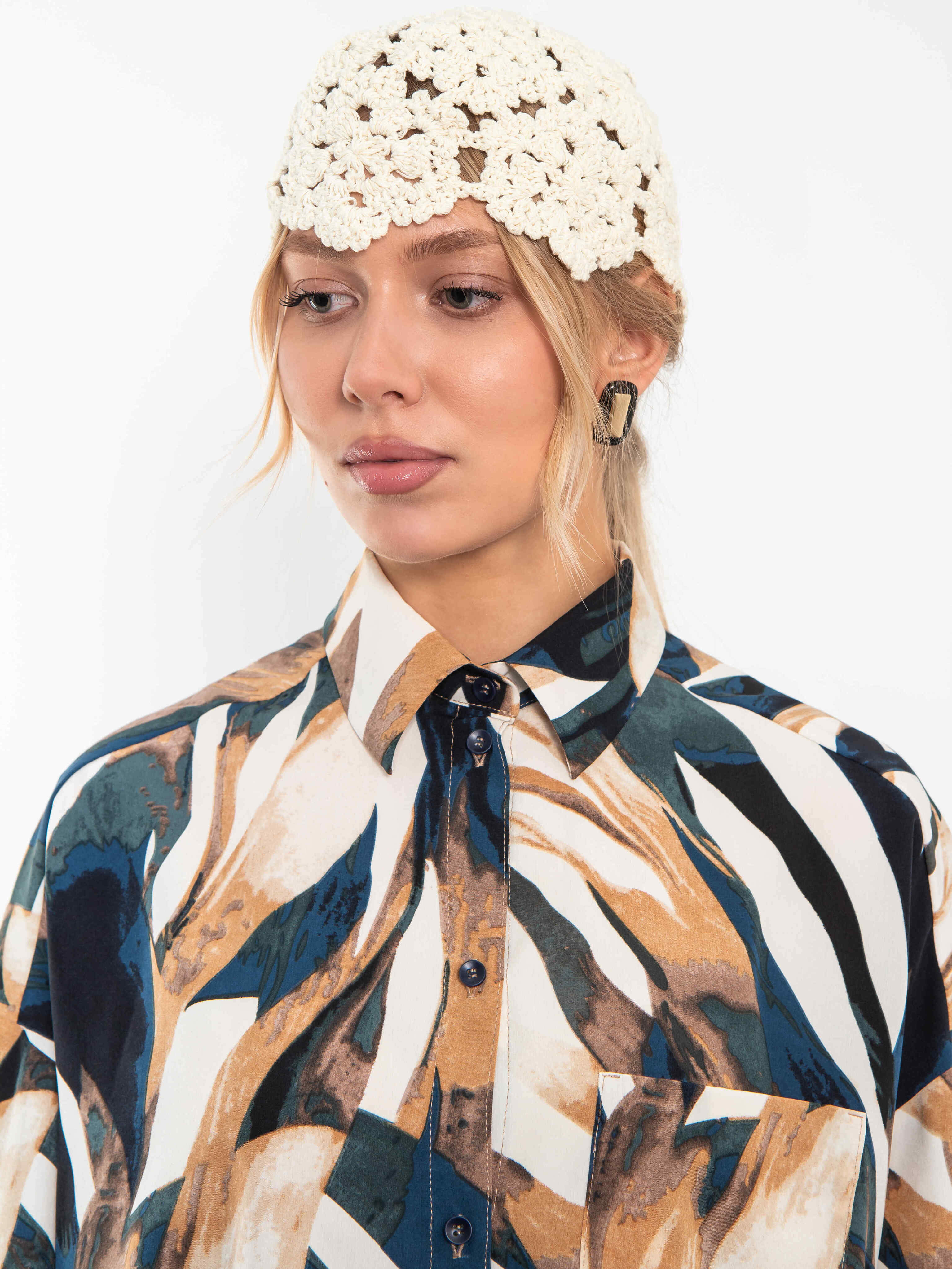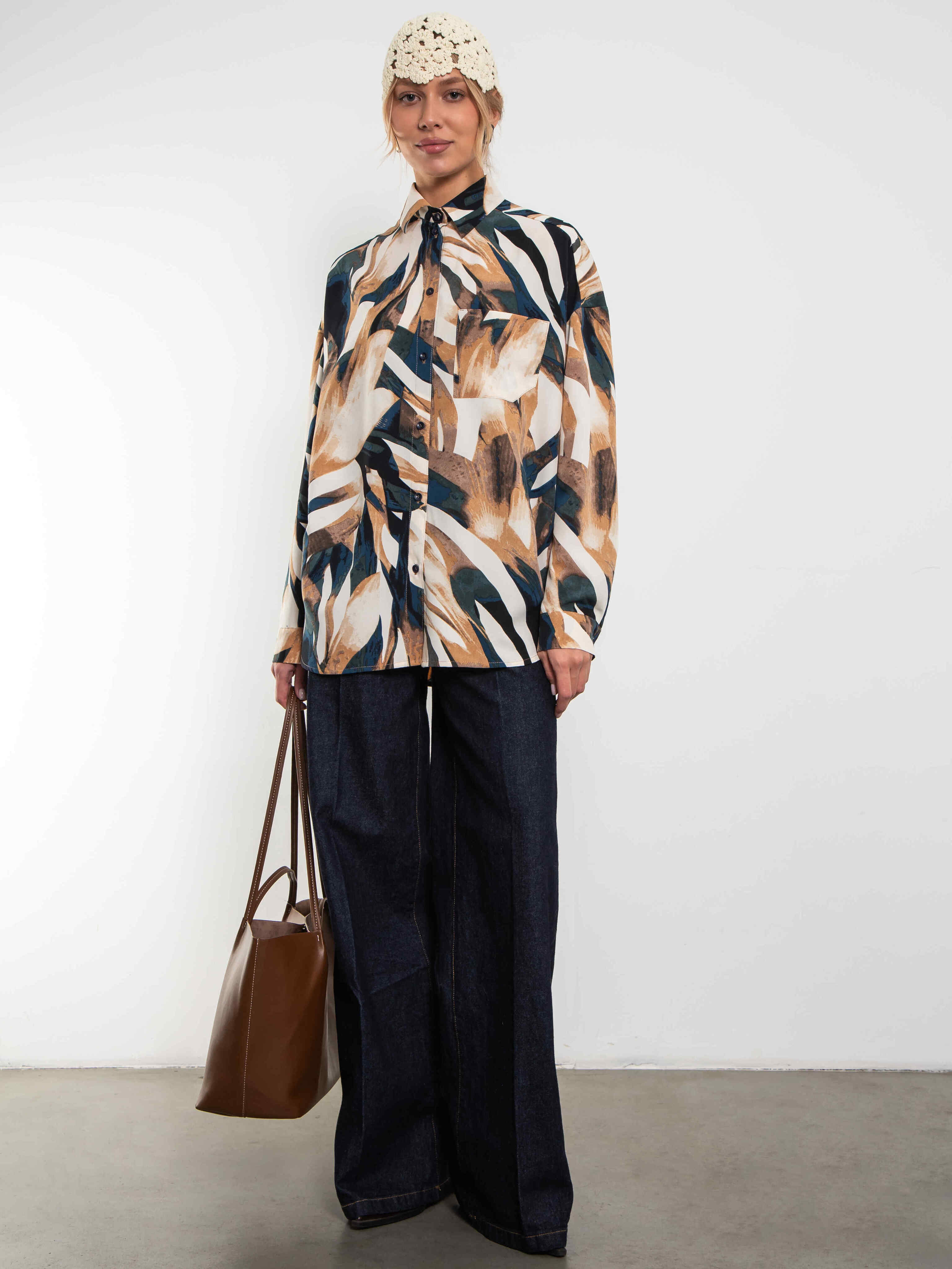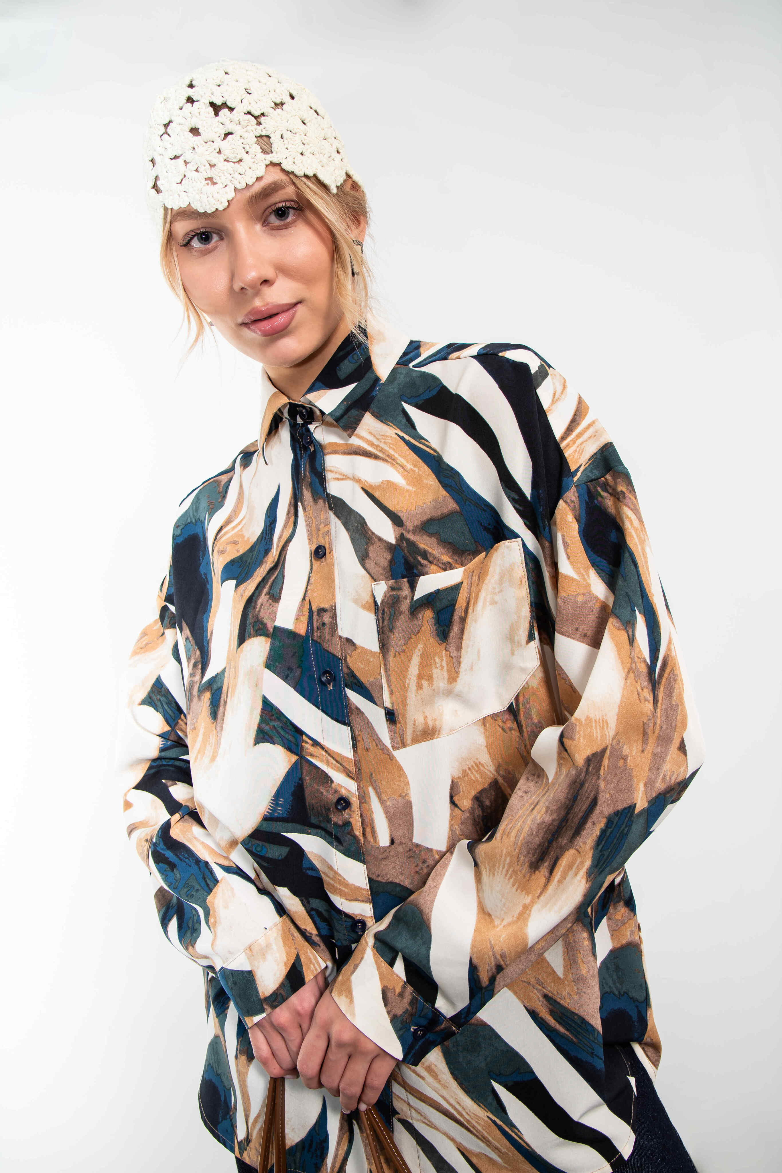Универсальная рубашка oversize с нагрудным карманом. Застегивается на пуговицы.