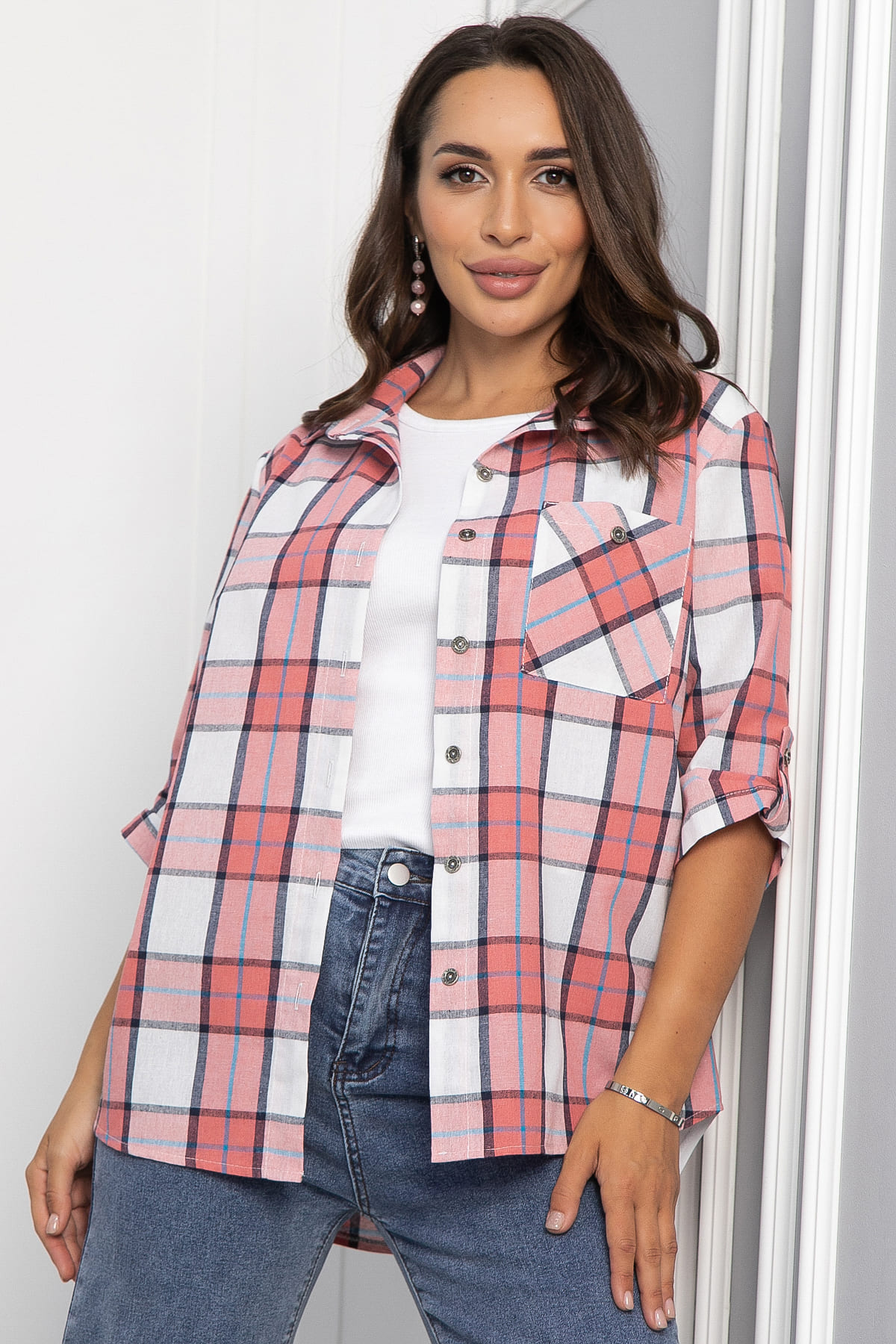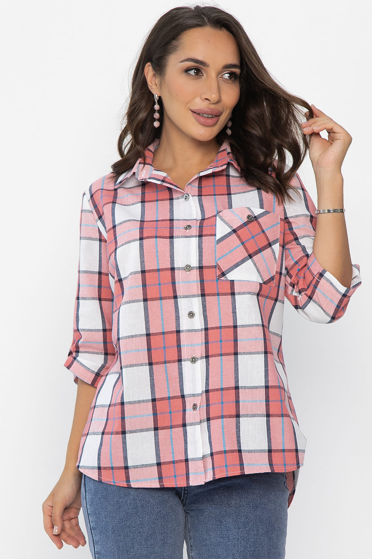 Рубашка полуприлегающего кроя в бело-розовом цвете станет отличным дополнением вашего гардероба. Она выполнена из качественного материала, обеспечивающего комфорт в носке. Застёжка на пуговках по переду придаёт изделию классический вид, а воротник рубашечного типа добавляет элегантности. Рукава втачные, с патой на пуговке, что позволяет регулировать их длину и создаёт стильный акцент. На передней части рубашки расположен накладной карман слева, который не только практичен, но и добавляет изюминку в общий дизайн. Эта рубашка идеально подходит как для повседневной носки, так и для более формальных мероприятий. Сочетайте её с брюками или джинсами для создания стильного образа!