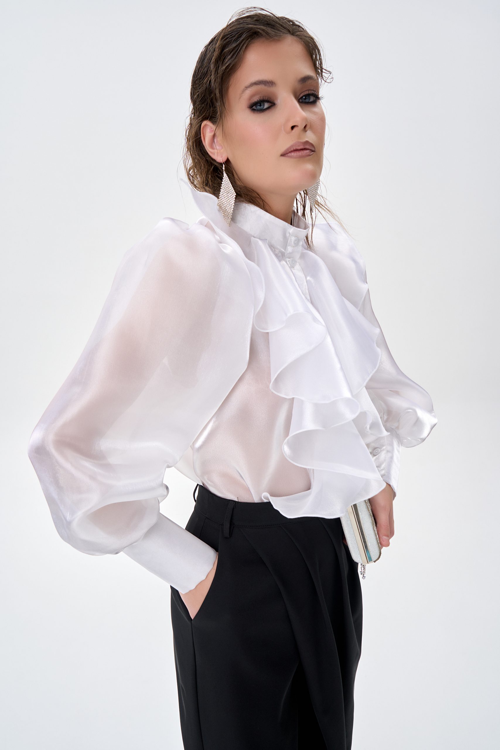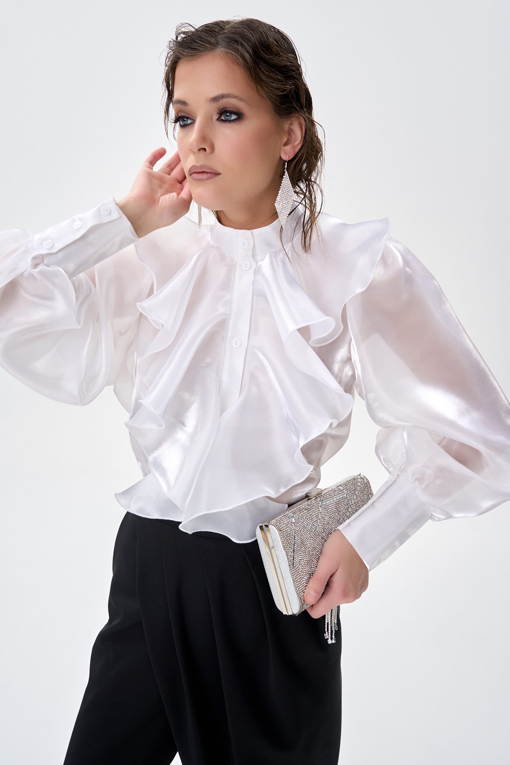 Рубашка “Алиша” из премиальной органзы, выполненная из лёгкой полупрозрачной ткани с благородным сатиновым блеском. Модель выделяется выразительными объёмными оборками, которые создают многослойный декоративный эффект в зоне груди и придают образу утончённую архитектурность.