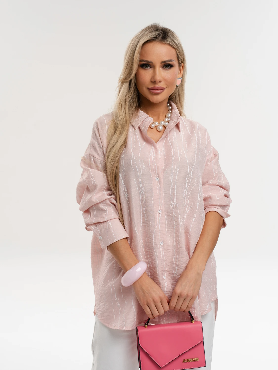 Рубашка свободного кроя со спущенным плечом.