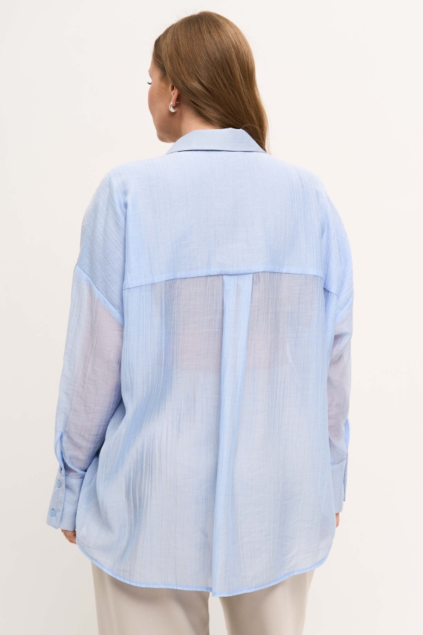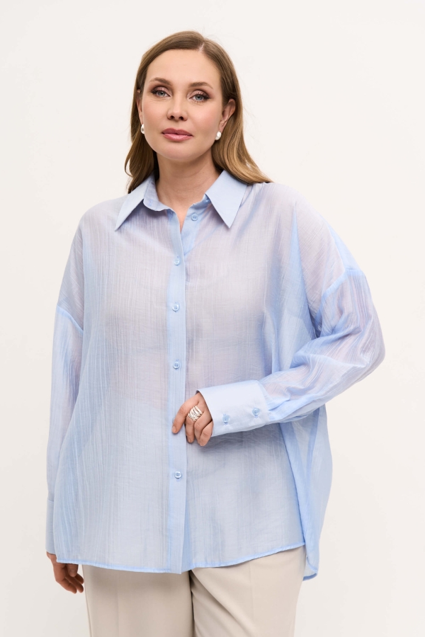 Свободная блуза- рубашка со спущенным плечом. Застежка на пуговицы и петли, отложной воротник на стойке, фигурный низ, на спинке кокетка и складка. Рукава с манжетами.
