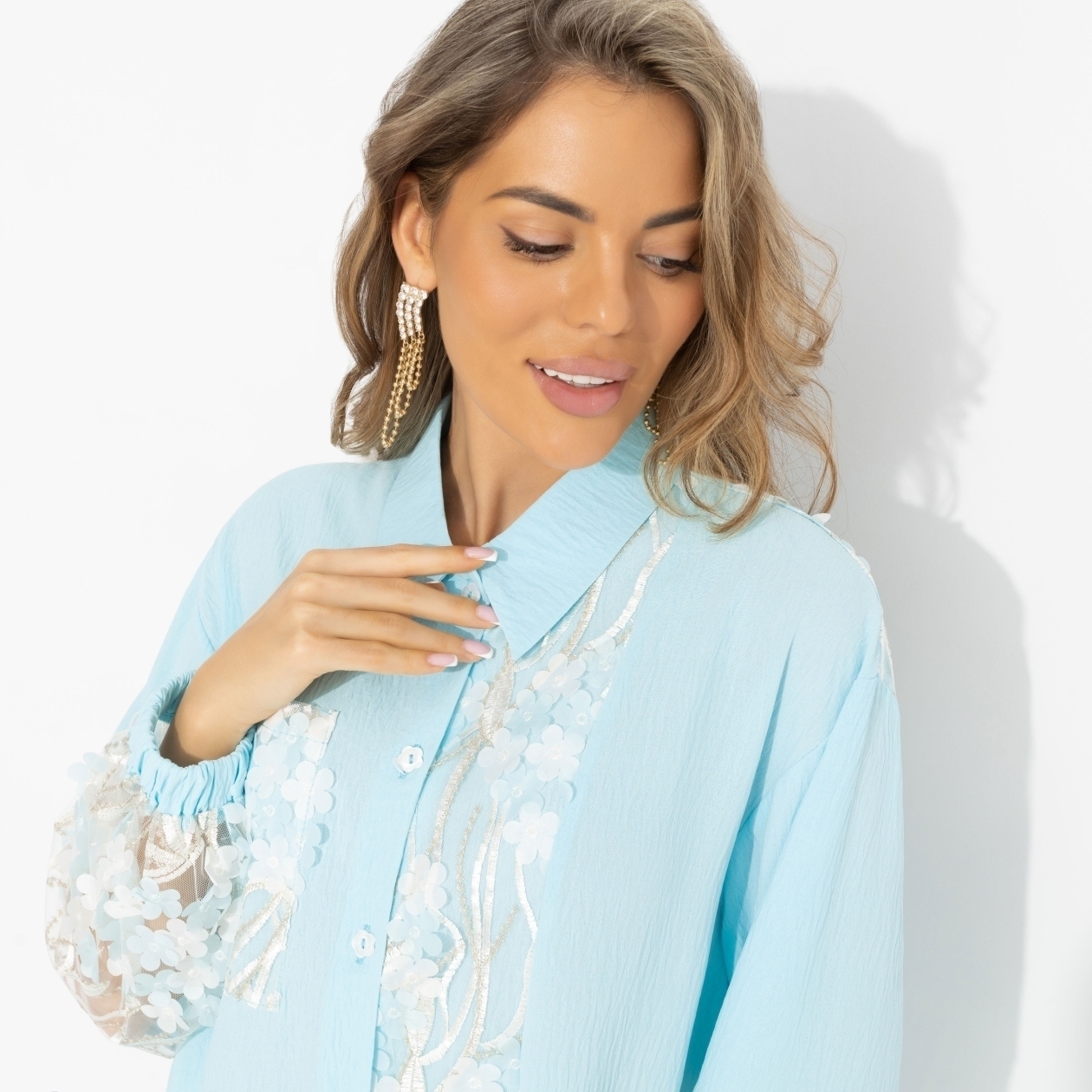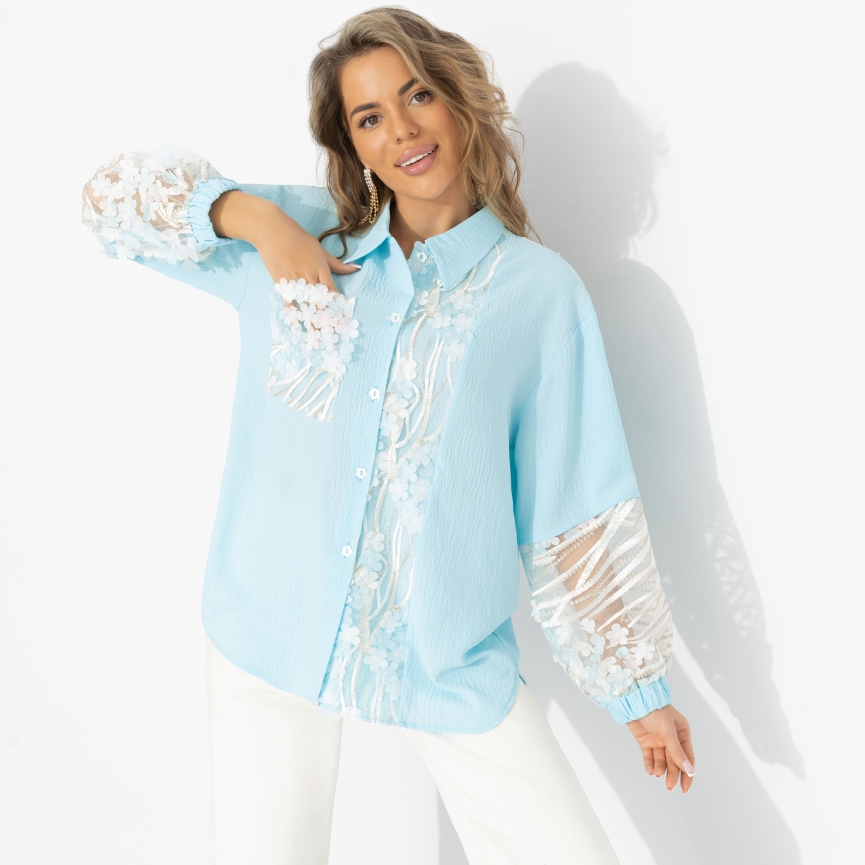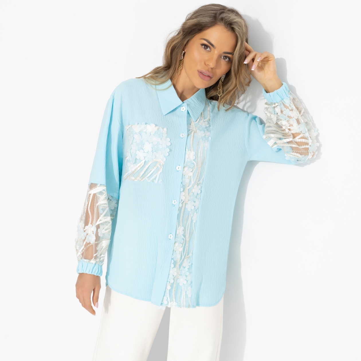 А если этой весной позволить себе чуть больше света и воздуха? Рубашка ЧАРУТТИ в оттенке нежной бирюзы буквально говорит: скоро весна, голубое небо и теплая утренняя погода. Прозрачная вышивка на сетке добавляет лёгкой смелости, но делает образ не дерзким, а живым – как ощущение, что впереди обязательно вас ждёт что-то хорошее. Свободный крой не сковывает, а эластичность плательной ткани даёт ощущение комфорта. Рубашка отлично смотрится с белыми брюками, денимом и светлыми юбками.