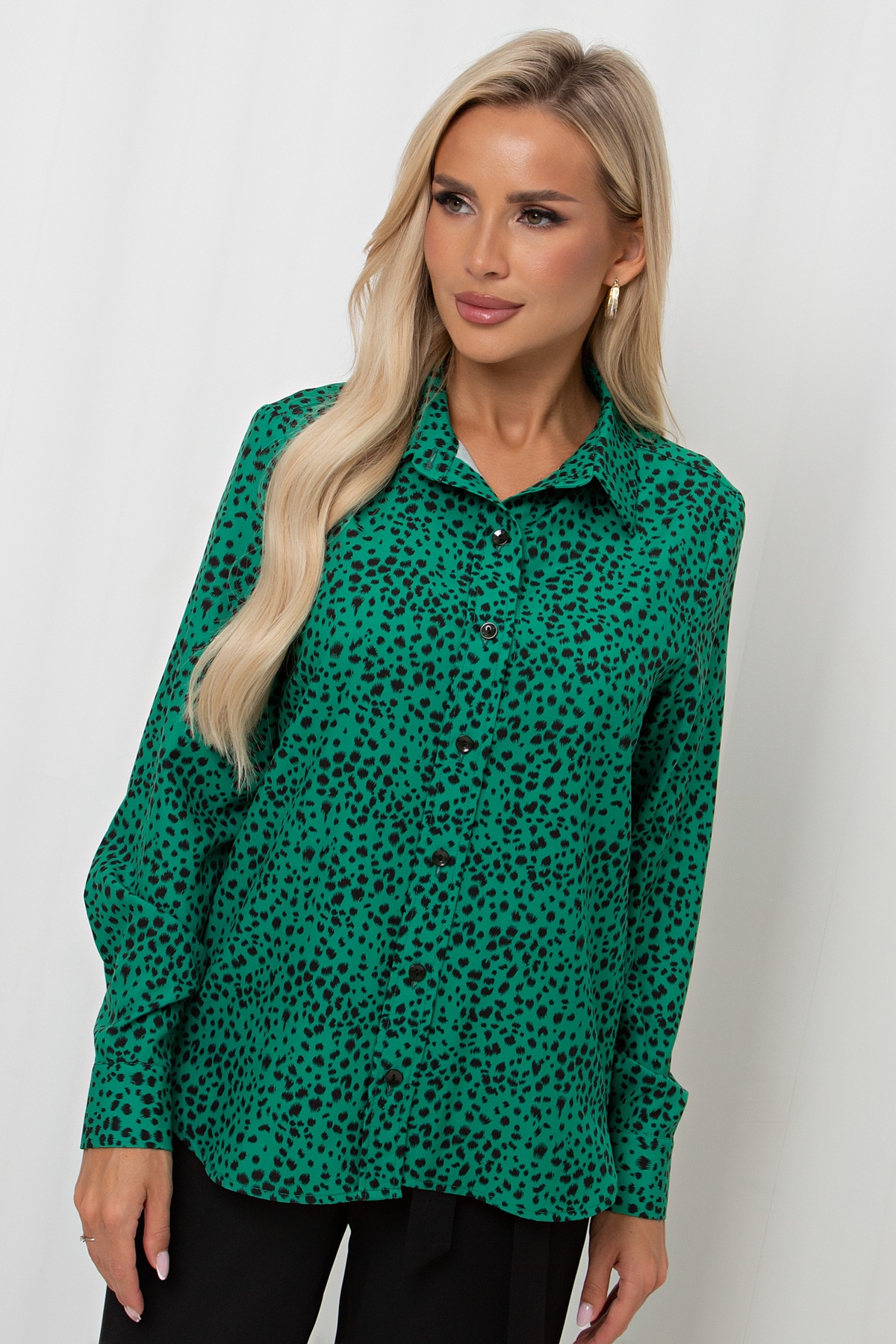 Стильная рубашка прямого силуэта с оригинальным принтом. Длинные втачные рукава оканчиваются манжетами с застежкой на пуговицу. Горловина оформлена классическим воротником на стойке, переходящим в планку с застежкой на пуговицы. Спинка дополнена кокеткой со складкой. Низ фигурный, без разрезов. Рубашка отлично смотрится как заправленная, так и на выпуск.