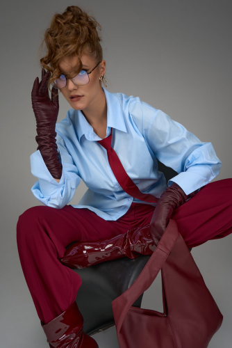 Стильная удлинённая рубашка прямого кроя с акцентом на талию.