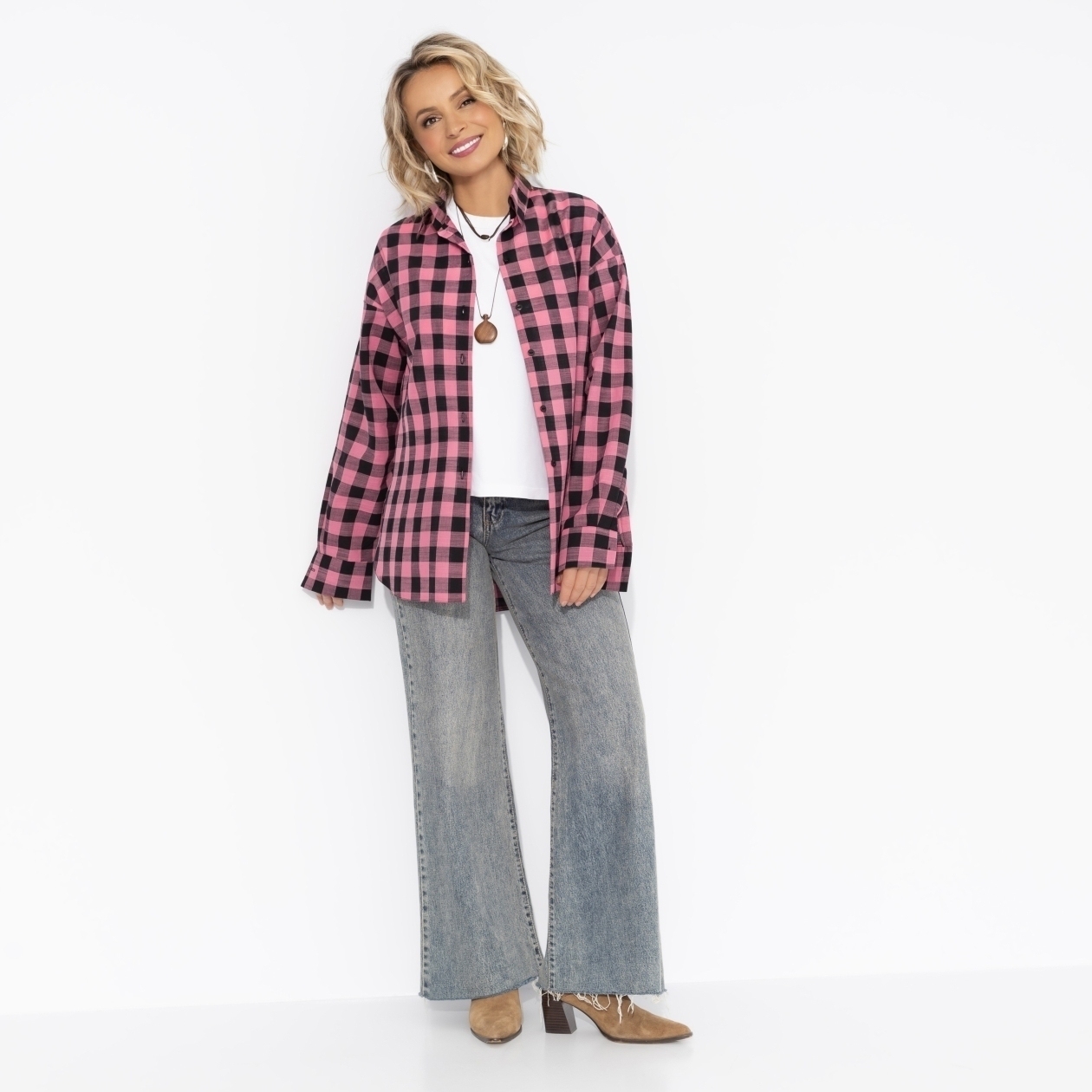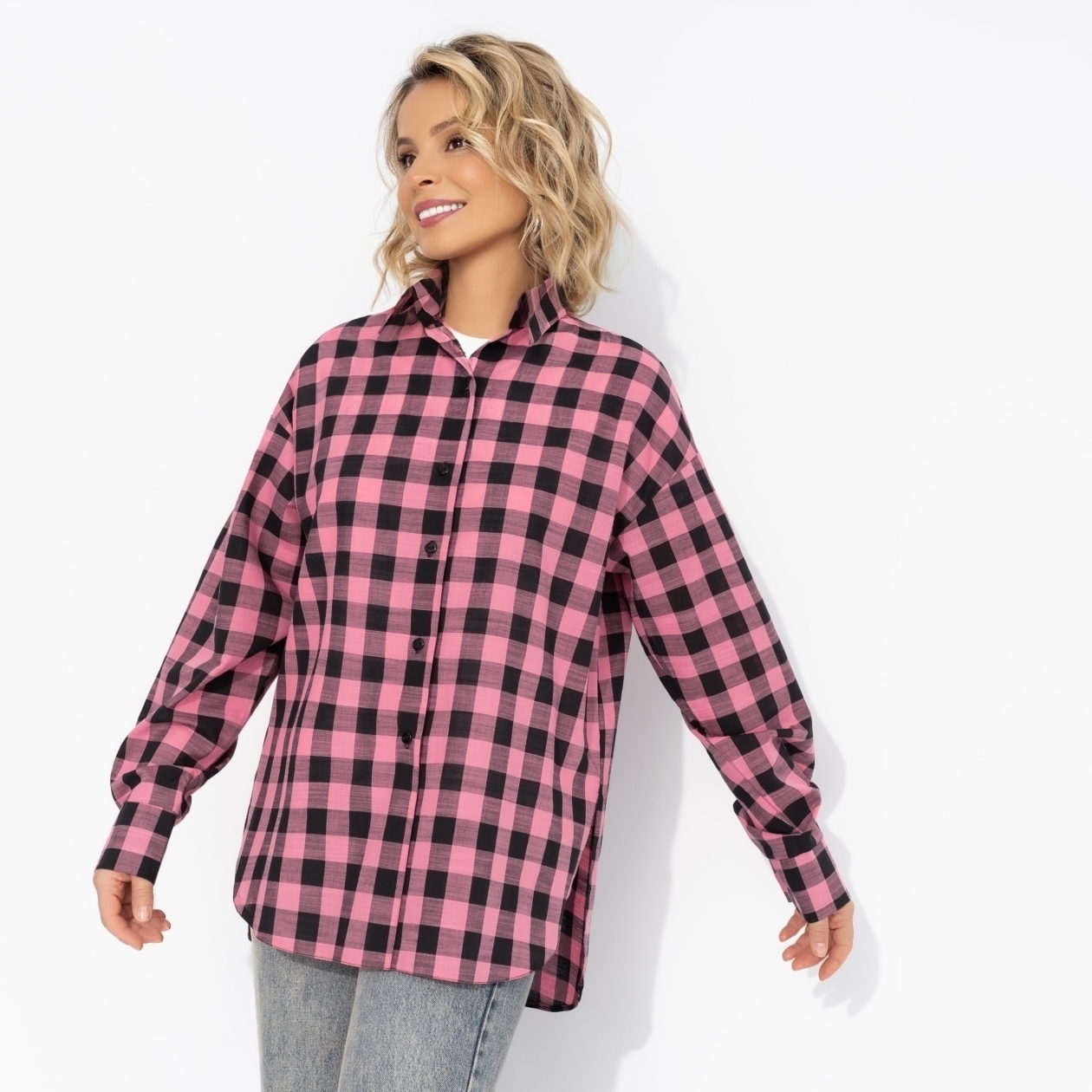 Она надела рубашку ЧАРУТТИ в розовую клетку и сразу почувствовала себя главной героиней этого дня. Рубашка подстраивалась под её настроение – то уютно обнимала, то многообещающе распахивалась на ветру.«Ты выглядишь как само счастье!», – отметили подруги при встрече. Рубашка свободного кроя. Отлично смотрится на любом типе фигуры. Стиль oversize.