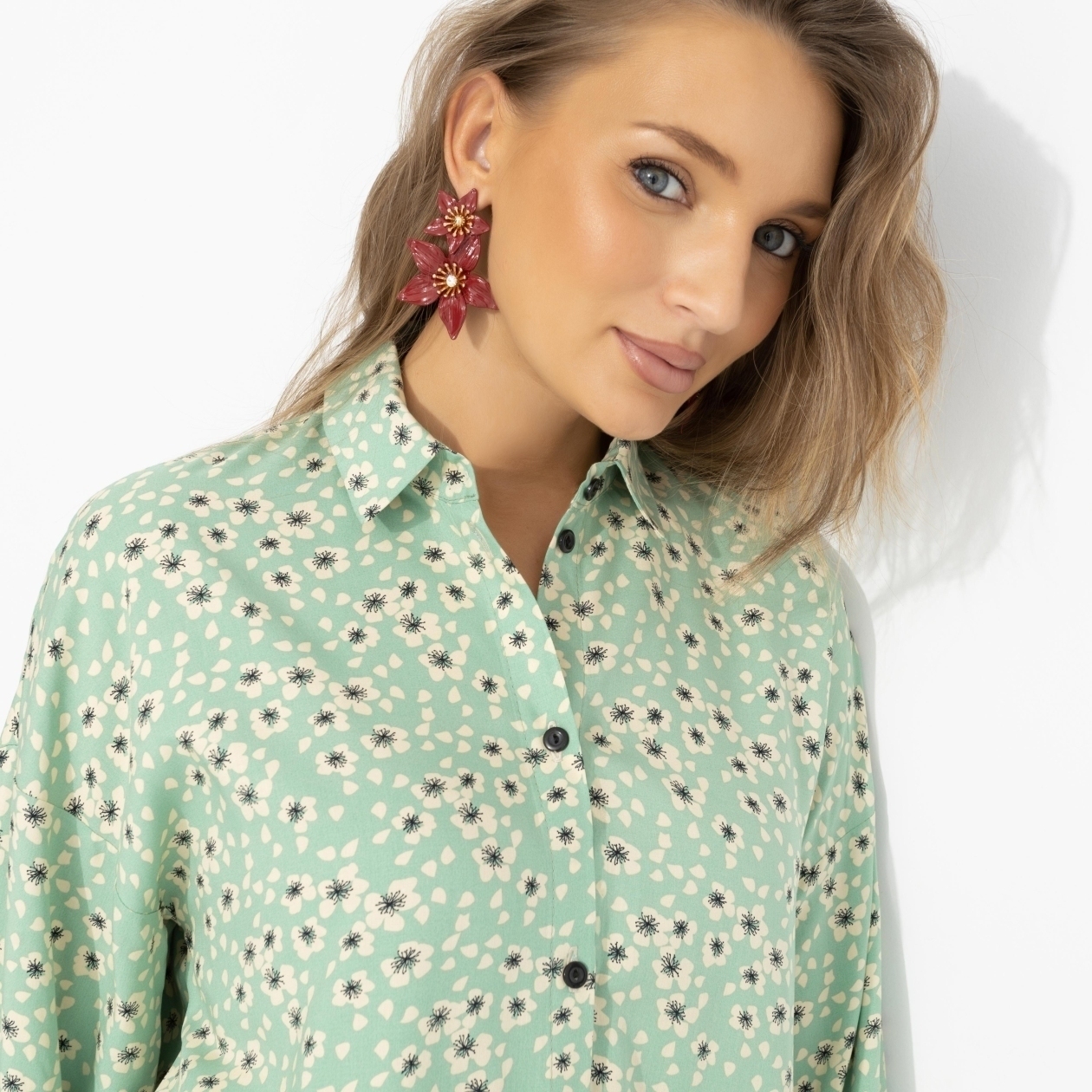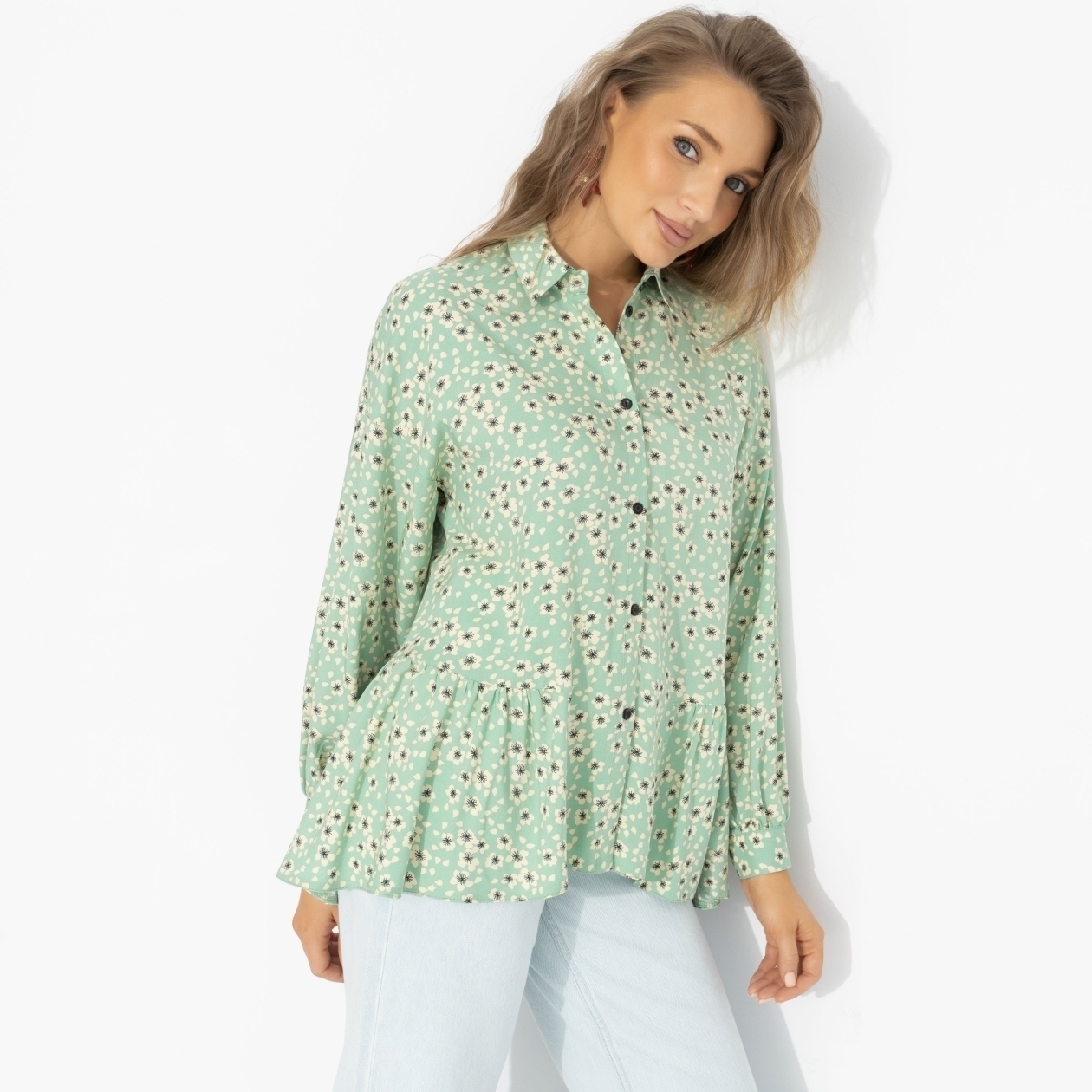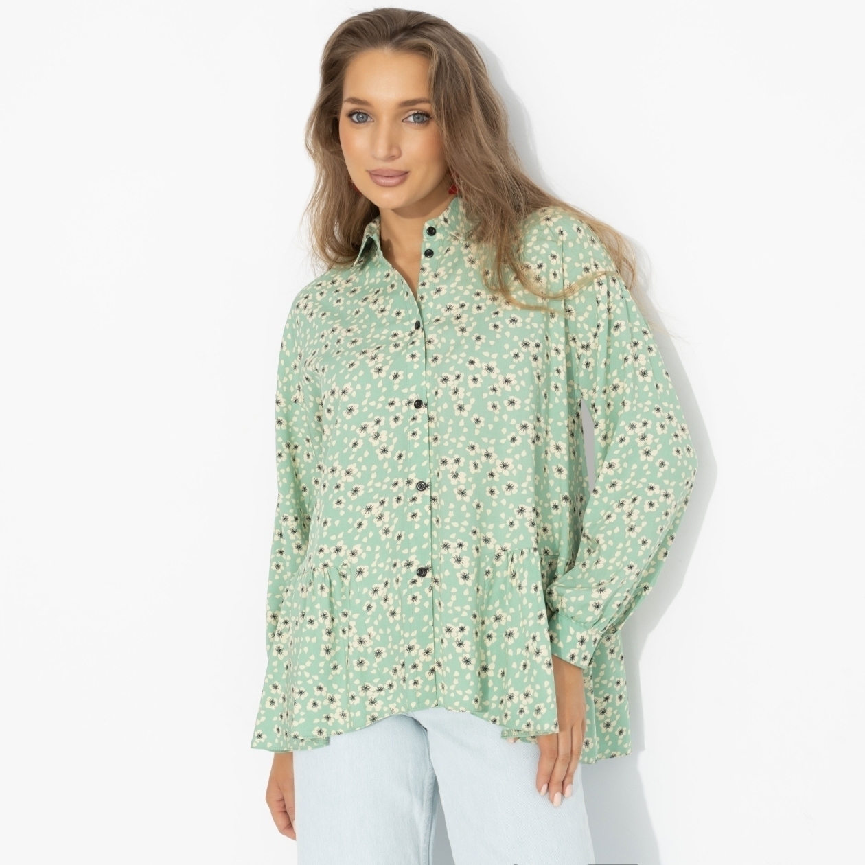 Тренд на новую женственность звучит всё громче: romantic core, силуэты ladylike, мягкий ретро-акцент 60-х. Эта рубашка попадает точно в волну. Мятный оттенок освежает палитру сезона, мелкий цветочный принт добавляет винтажного шарма, а баска придаёт образу романтичный флёр. Нежно – но с чётким пониманием, кто здесь главная.