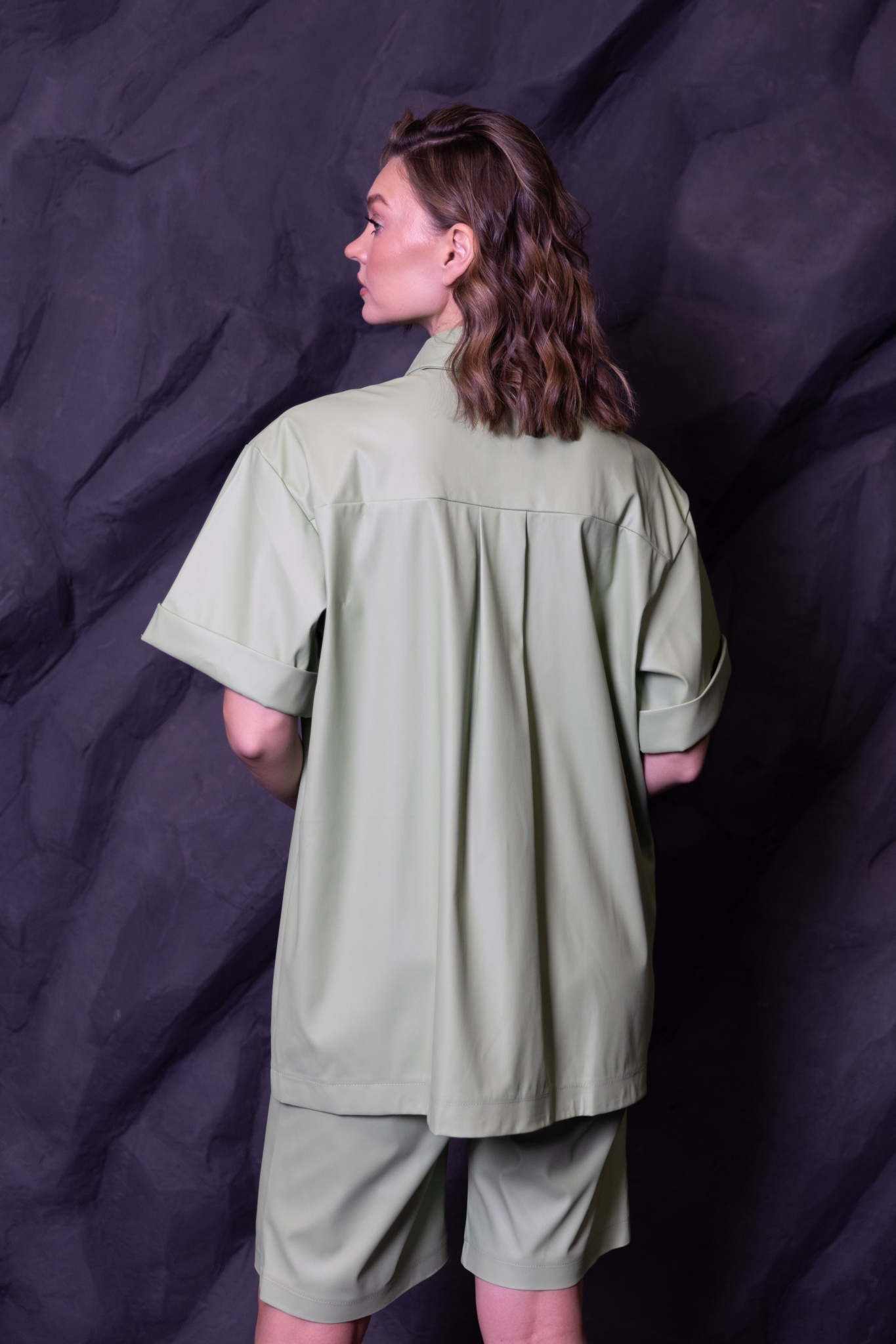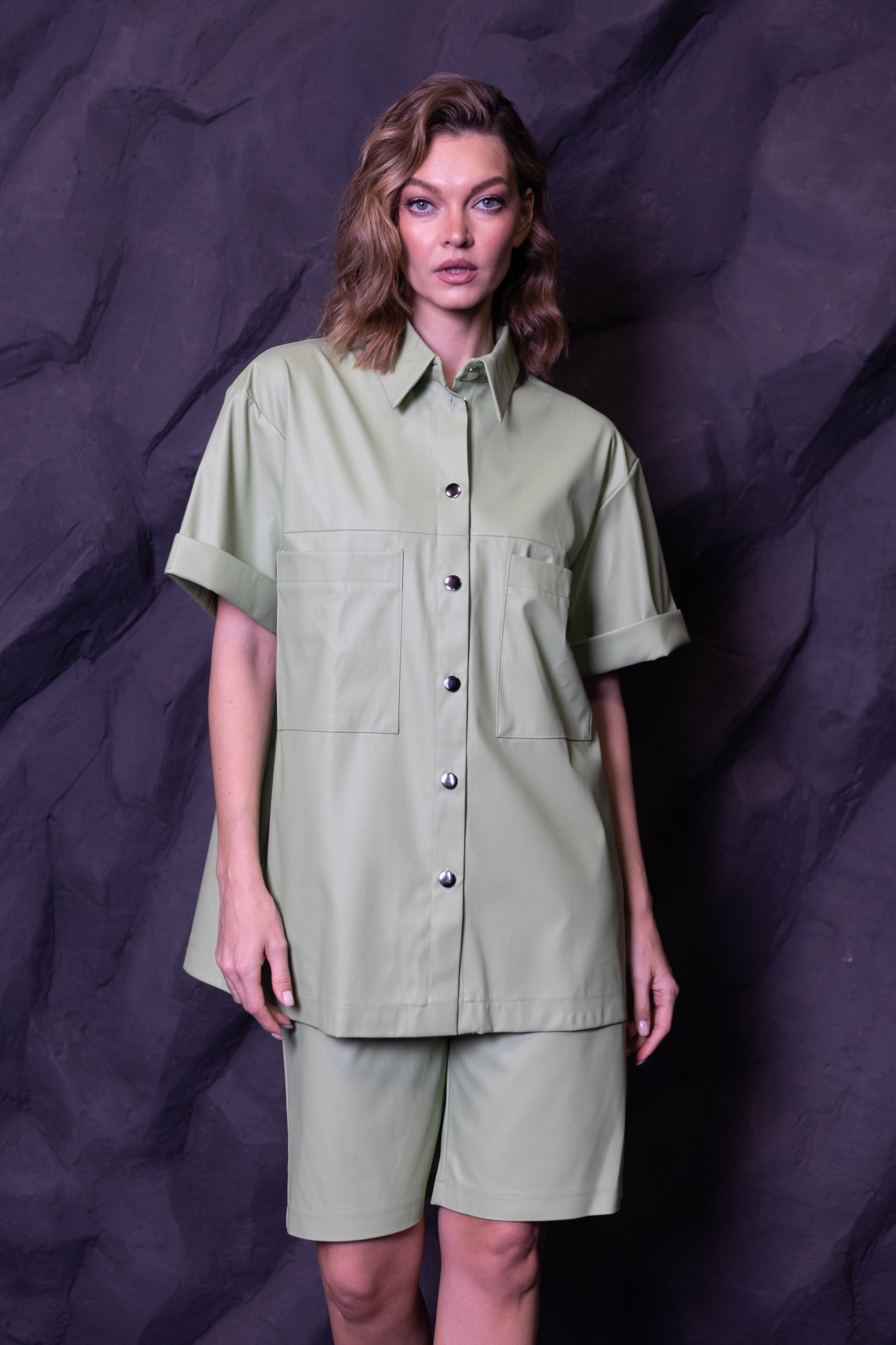 Рубашка в стиле oversize. Прямой крой, отложной воротник на стойке, спущенная линия плеча и рукава с манжетами. По переду и спинке кокетка, два накладных кармана на груди, складка под кокеткой на спинке.