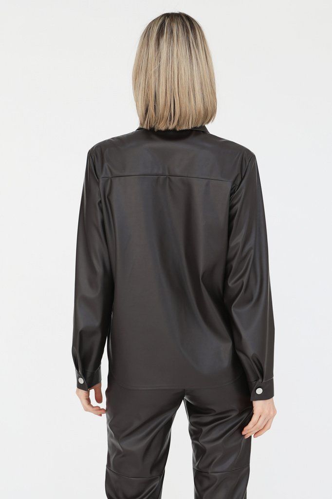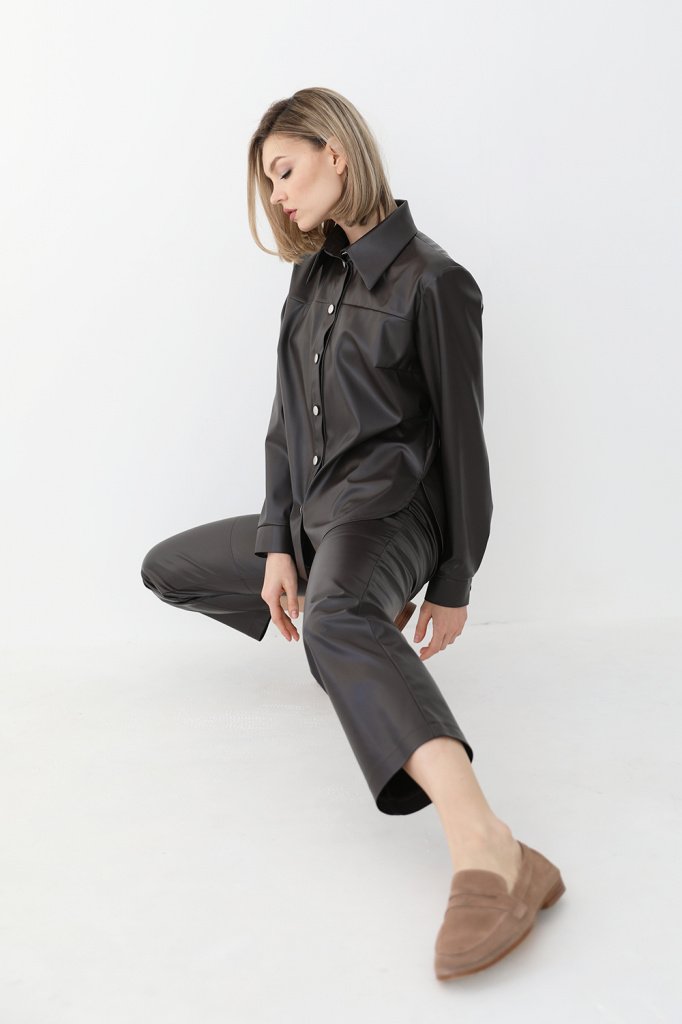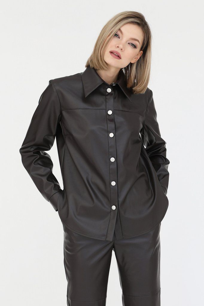 Рубашка из экокожи на пуговицах прямого кроя с фигурным низом, втачным рукавом и манжетой, отложным воротником и кокеткой по переду и спинке.