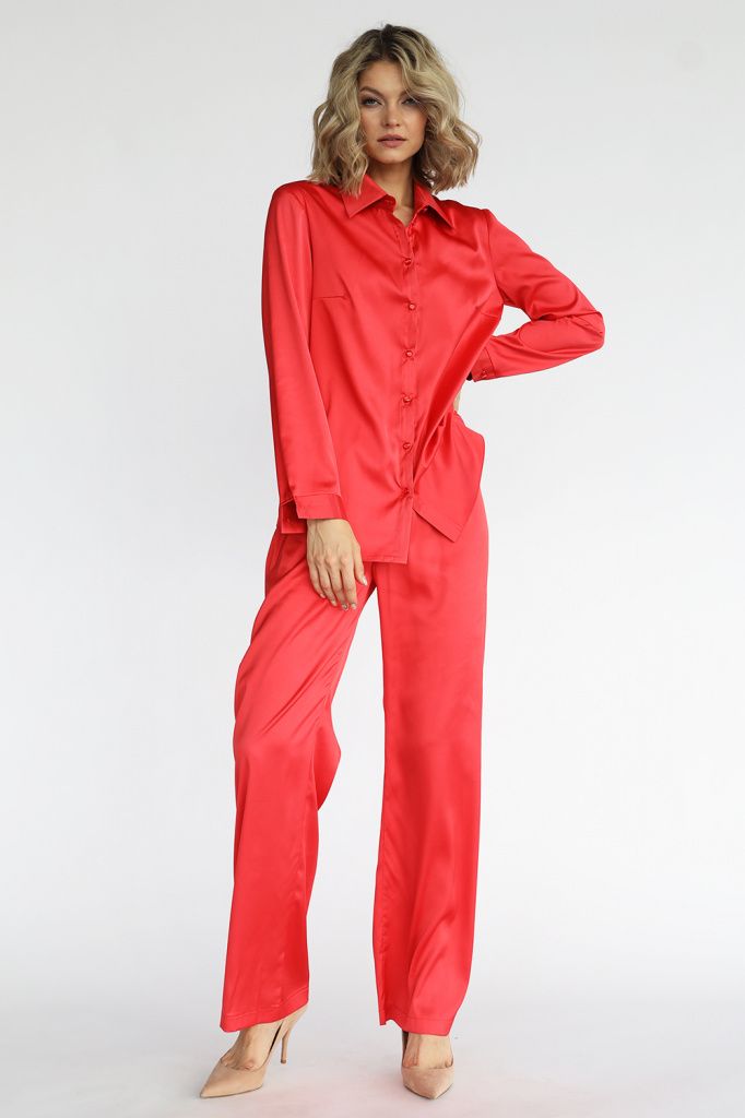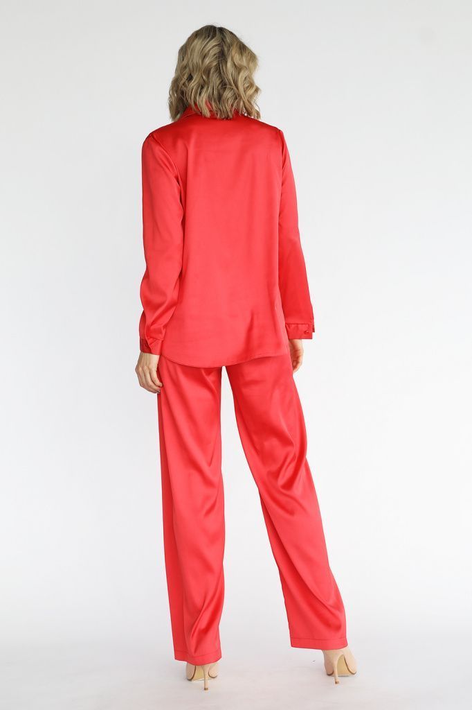 Блузка из искусственного шелка с отложным воротником на стойке и застежкой на пуговицы, втачной рукав с манжетой и пуговицей.