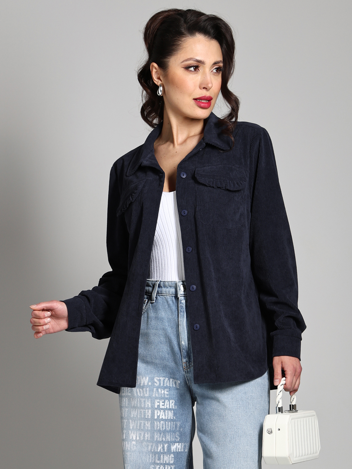 Вельветовая рубашка с акцентными карманами — универсальная вещь, которая поможет создать множество модных образов как на каждый день, так и в офис. Отложной воротничок, лаконичные пуговицы в тон, длинные рукава с манжетами и стандартная длина приближают модель к классической, элегантной сорочке, что позволяет без труда вписать ее в гардероб. Отличительная черта рубашки это не только приятный на ощупь микровельвет, но и накладные карманы, которые украшены рюшами. Эта изюминка придает изделию женственные, игривые нотки и делает ее более нарядной. Теплую, удобную рубашку можно носить как в качестве самостоятельного элемента гардероба, так и в виде верхнего слоя — наподобие куртки или жакета. В обоих случаях модель из вельвета будет выглядеть дорого и стильно. Качественный, плотный и мягкий материал хорошо сохраняет тело и дарит ощущение уюта. Рекомендуем стирать в деликатном режиме.