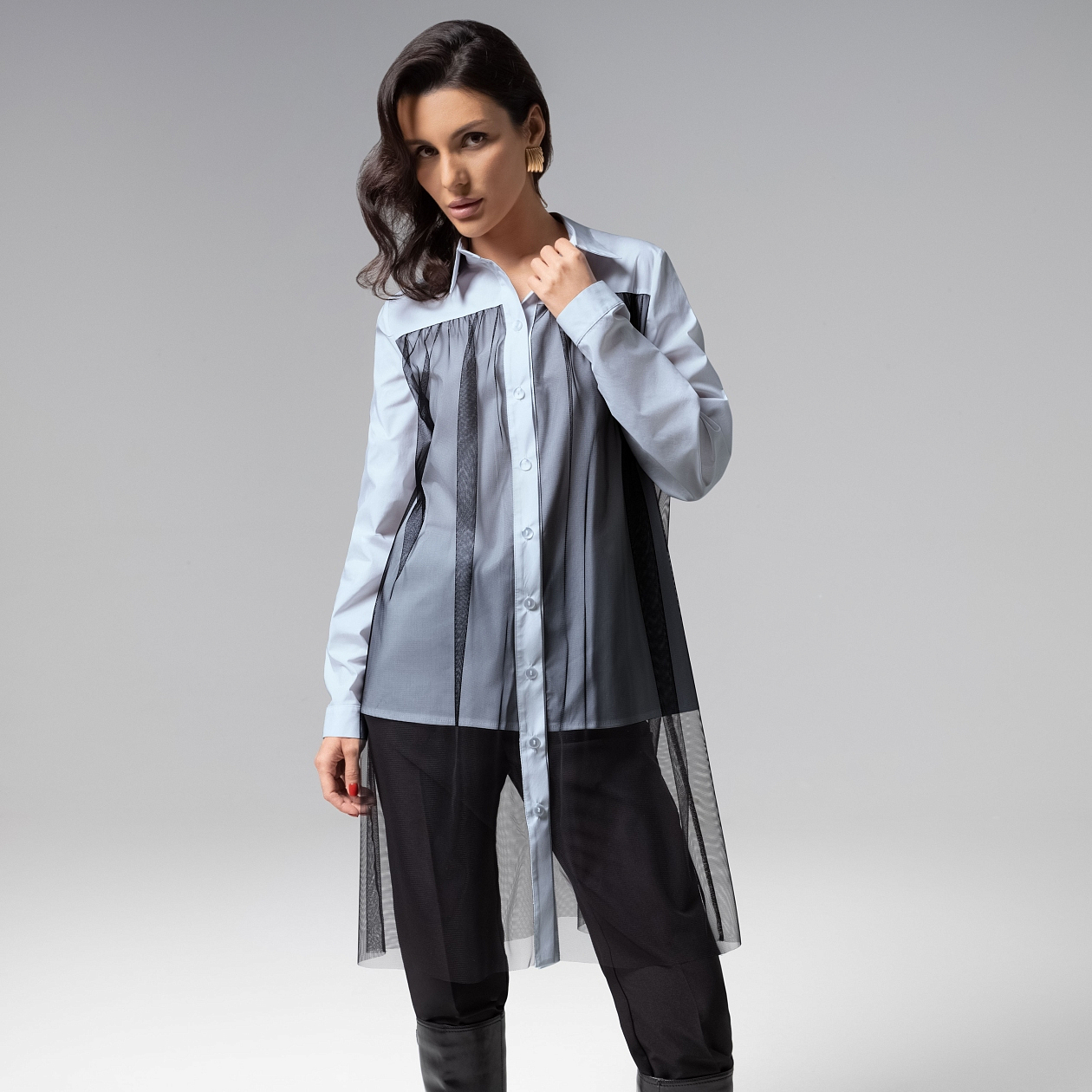 Выглядеть модно и роскошно – прерогатива самых смелых. Рубашка акцентного кроя из коллекции ПРЕМИУМ вызывает неподдельный восторг. Комбинация рубашки из премиального хлопка и тончайшей сетки создана дизайнерами ЧАРУТТИ как изделие высокого класса. Безупречные лекала и акцентный дизайн. Не упускайте возможность впечатлять. Рубашка классического силуэта с верхним удлиненным слоем из сетчатой ткани. Сетка прошита с двух сторон изделия.