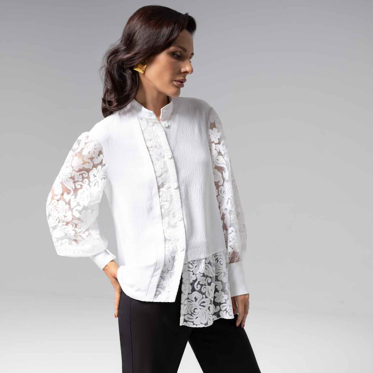 Рубашка ЧАРУТТИ – воплощение гармонии контрастов. Жатая ткань с благородной текстурой сочетается с воздушным кружевом премиального качества, создавая эффект баланса между строгостью и романтикой. Сложный крой с воротником-стойкой и асимметричными рельефами подчеркивает архитектурность силуэта. Рубашка сохраняет элегантную фактуру даже после долгого дня, а кружево, сотканное из тончайших хлопковых нитей, не теряет нежную форму. Кружевные вставки с флорентийским узором на объемных полупрозрачных рукавах добавляют воздушности.