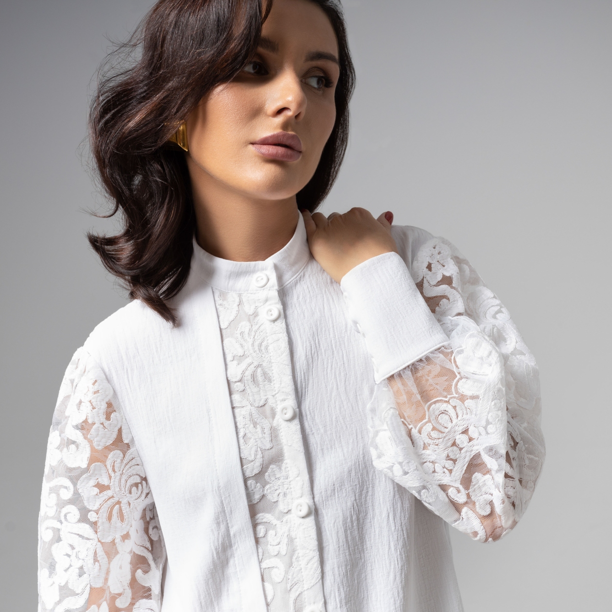 Рубашка ЧАРУТТИ – воплощение гармонии контрастов. Жатая ткань с благородной текстурой сочетается с воздушным кружевом премиального качества, создавая эффект баланса между строгостью и романтикой. Сложный крой с воротником-стойкой и асимметричными рельефами подчеркивает архитектурность силуэта. Рубашка сохраняет элегантную фактуру даже после долгого дня, а кружево, сотканное из тончайших хлопковых нитей, не теряет нежную форму. Кружевные вставки с флорентийским узором на объемных полупрозрачных рукавах добавляют воздушности.
